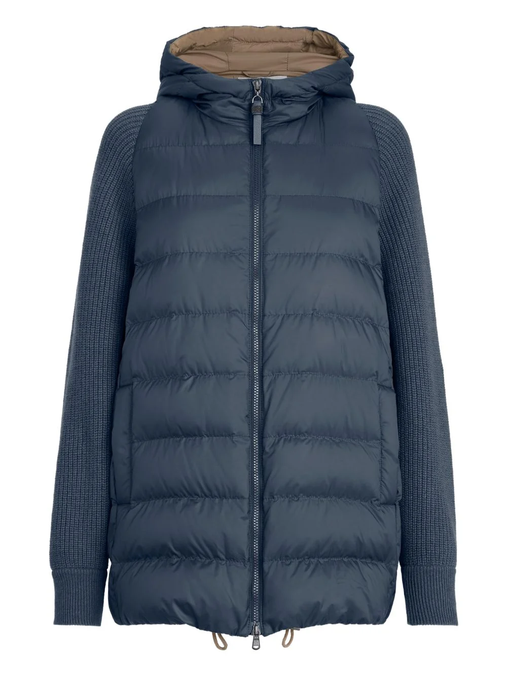 Water-resistant matte nylon hooded down jacket with virgin wool, cashmere and silk knit sleeves and