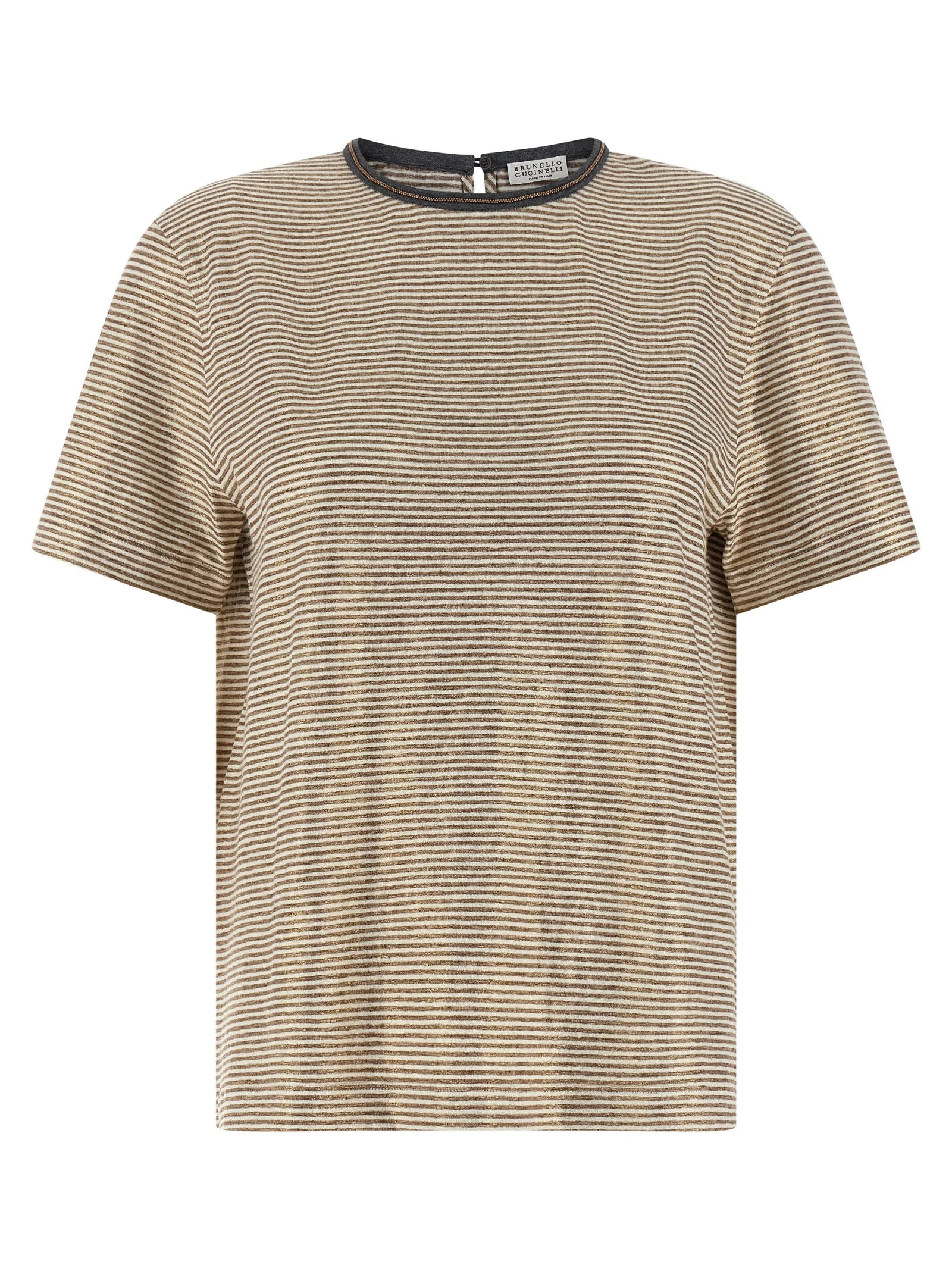 Striped stretch linen T-shirt with crewneck and contrast piping, 'Shiny Collar Detail' in Monile and back button closure with cut-out teardrop detail, and short sleeves. true to size fit 96% linen, 4% elastane SKU: MQ977DU500C2094 Our Products Are 100% Genuine. In All Cases We Stand By The Authenticity Of Every Product Sold On Our Site. All sales are final and we only accept returns for quality issue. Buyer is responsible for any import tax/duty if applicable.
