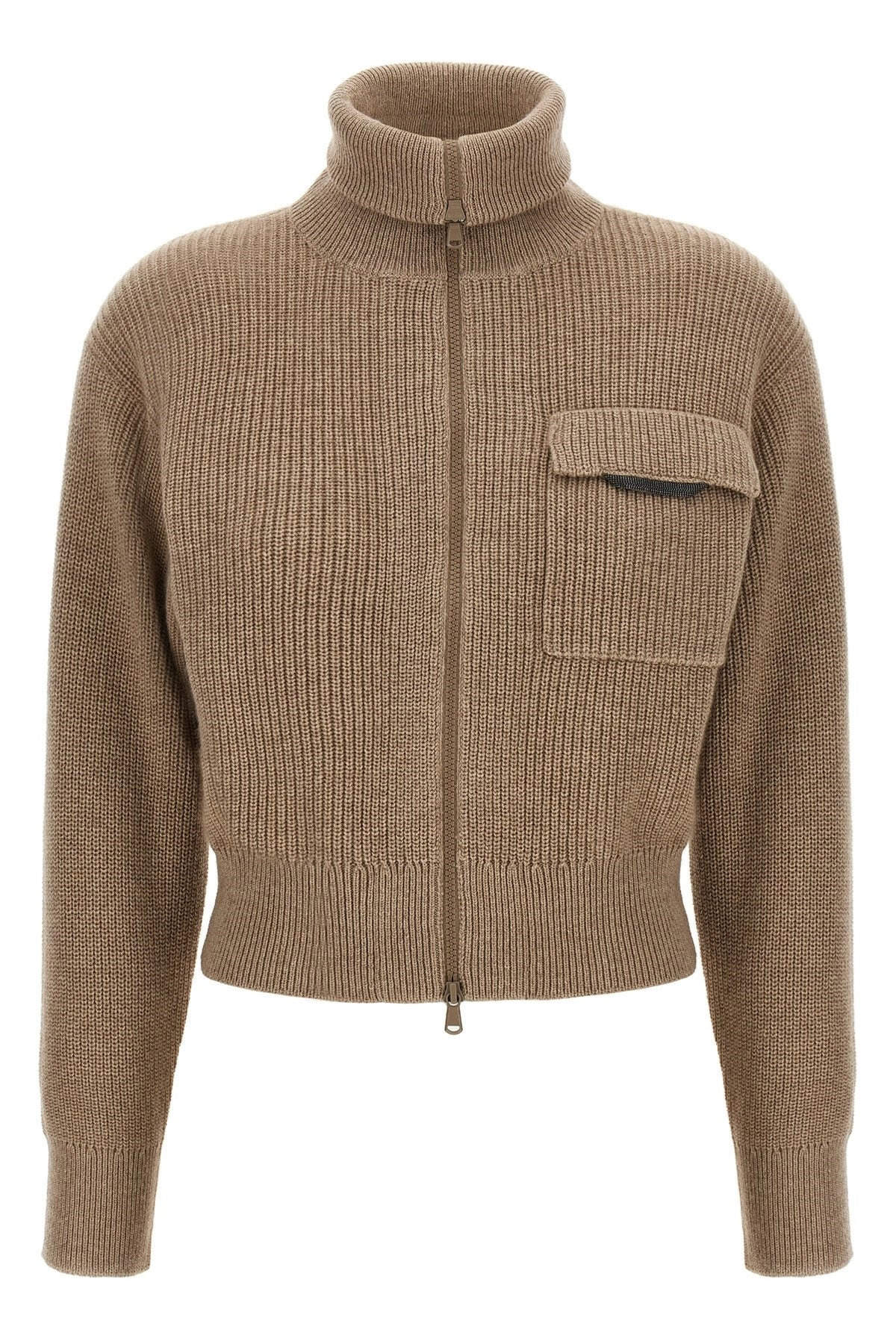 Cashmere cardigan worked in cropped sweater, high neck, front zip closure, breast pocket with Monile 'Shiny Flap Detail' and long cuffed sleeves. Color: Beige Size & Fit: true to size fit Composition: 100% cashmere Made in: Italy SKU: M12721706PC077 Our Products Are 100% Genuine. In All Cases We Stand By The Authenticity Of Every Product Sold On Our Site. All sales are final and we only accept returns for quality issue. Buyer is responsible for any import tax/duty if applicable.