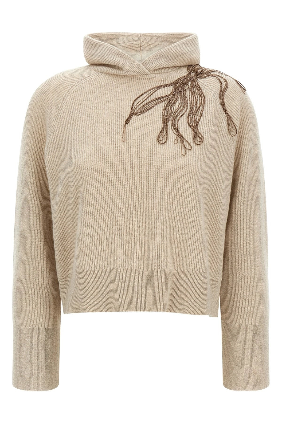 English ribbed cashmere hooded sweater with 'Shiny Flower Embroidery' embroidery with thin jewel threads on the front, long sleeves with dropped shoulders. Color: Beige Size & Fit: Relaxed fit Composition: 100% cashmere Made in: Italy SKU: M12218909C9731 Our Products Are 100% Genuine. In All Cases We Stand By The Authenticity Of Every Product Sold On Our Site. All sales are final and we only accept returns for quality issue. Buyer is responsible for any import tax/duty if applicable.