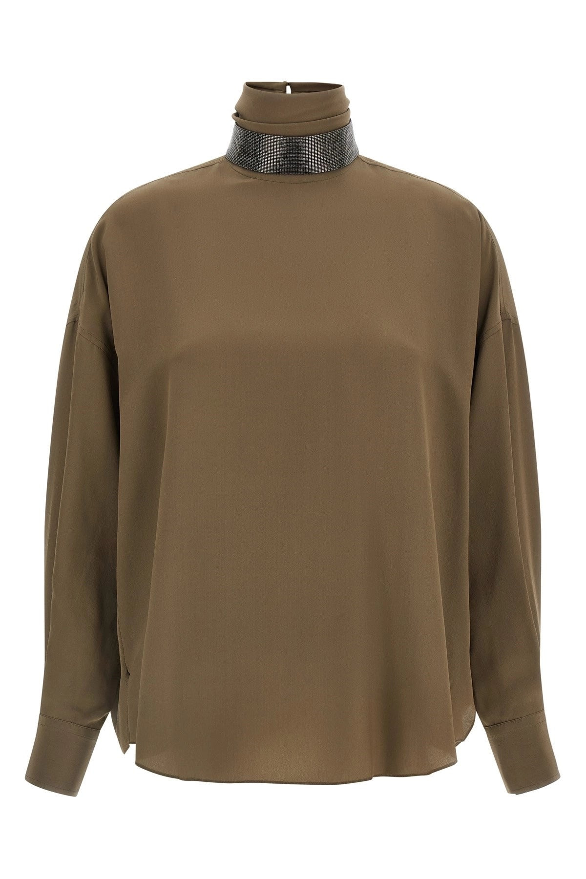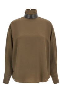 Silk blouse, high neck with removable 'Monile' accessory, back button closure, long sleeves with cuffs and button. Color: Brown Size & Fit: True to size fit Composition: 100% silk Made in: Italy SKU: MB993EK724C3981 Our Products Are 100% Genuine. In All Cases We Stand By The Authenticity Of Every Product Sold On Our Site. All sales are final and we only accept returns for quality issue. Buyer is responsible for any import tax/duty if applicable.