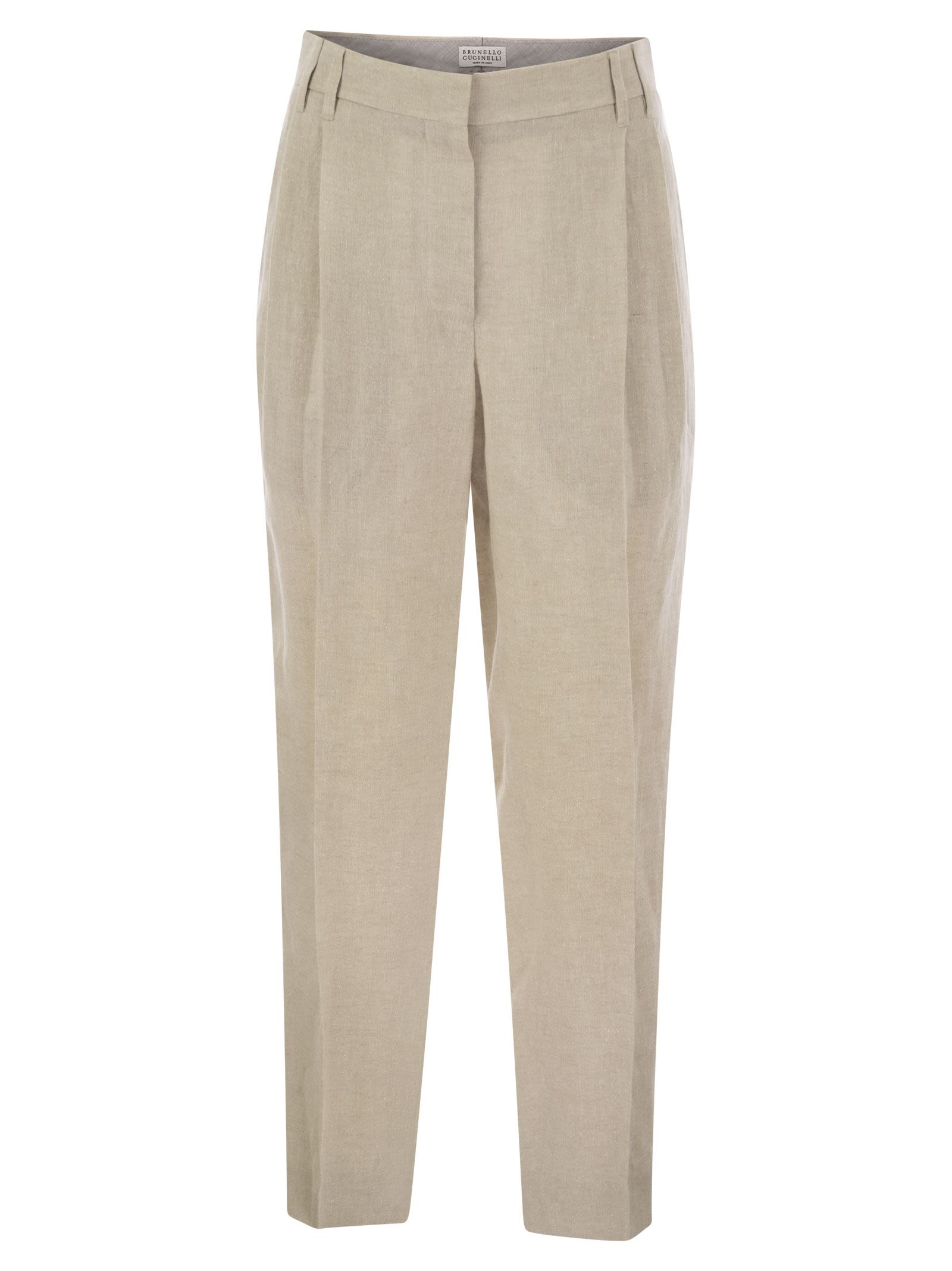 Delicate lame reflections enrich the Slouchy trousers in Sparkling linen canvas. The relaxed silhouette dialogues in perfect harmony with the tailored dart that runs along the entire length and gives the model an impeccable look. The precious jewel embroidery adds a delicate touch of feminine light, in pure Brunello Cucinelli style. The Sparkling canvas is composed of two yarns: linen and very fine lame yarn. The remarkable fineness and quality of the linen fibres give the fabric a softness and a fresh, pleasant touch. The lame yarn adds lustre to the rustic character of the linen and makes it more feminine and delicate. - Zip fastening with metal hook and counter-button - Front pocketsDouble darts - Back pockets - Unlined - Nickel-free jewel decoration DESIGNER ID: MH547P8308 C169 97% Linen, 2% Polyester, 1% Polyamide Lining: 65% Acetate, 35% Polyester Inner waistband: 100% Cotton Application Eco finish brass Size Type: IT SKU: MH547P8308C169 Our Products Are 100% Genuine. In All Cases We Stand By The Authenticity Of Every Product Sold On Our Site. All sales are final and we only accept returns for quality issue. Buyer is responsible for any import tax/duty if applicable.