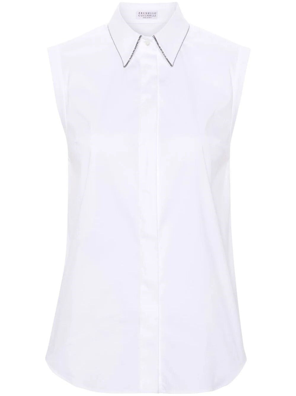 Brunello Cucinelli Women Stretch Cotton Poplin Sleeveless Shirt With `Shiny` Trim