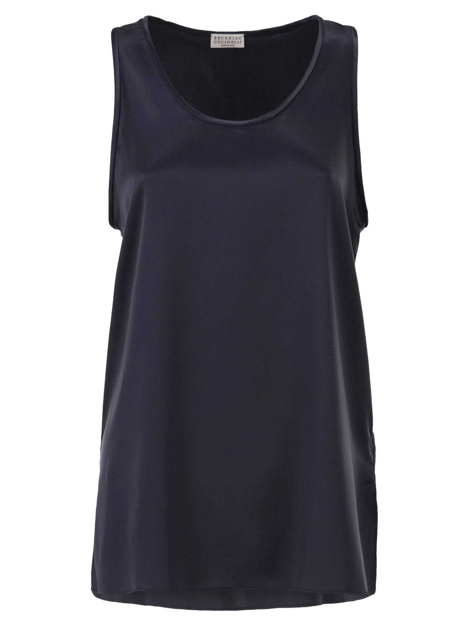 The simplicity of the lines meets the luxurious sheen of silk in this Brunello Cucinelli top, a key piece designed to elevate the female wardrobe with understated elegance. The fine silk satin is skilfully blended with a small percentage of elastane to offer a fluid feel, natural shine and superior comfort when worn. The flowing silhouette is defined by a wide round neckline that enhances the decollete, while the linear cut makes it perfect both as a sophisticated under-jacket and as the centrepiece of minimalist evening outfits. Every detail, from the softness of the seams to the finish of the crew neck, reflects the craftsmanship excellence of Solomeo. - Wide round neckline - Sleeveless with regular armholes - Satin fabric with a shiny finish - Flowing and comfortable fit - Regular hem with a thin hemline DESIGNER ID: M0C59DZ300 C8901 96% Silk, 4% Elastane Application Eco finish brass Size Type: INT SKU: M0C59DZ300C8901 Our Products Are 100% Genuine. In All Cases We Stand By The Authenticity Of Every Product Sold On Our Site. All sales are final and we only accept returns for quality issue. Buyer is responsible for any import tax/duty if applicable.