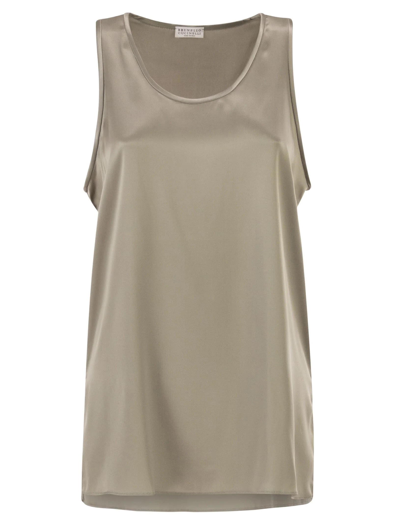 The simplicity of the lines meets the luxurious sheen of silk in this Brunello Cucinelli top, a key piece designed to elevate the female wardrobe with understated elegance. The fine silk satin is skilfully blended with a small percentage of elastane to offer a fluid feel, natural shine and superior comfort when worn. The flowing silhouette is defined by a wide round neckline that enhances the decollete, while the linear cut makes it perfect both as a sophisticated under-jacket and as the centrepiece of minimalist evening outfits. Every detail, from the softness of the seams to the finish of the crew neck, reflects the craftsmanship excellence of Solomeo. - Wide round neckline - Sleeveless with regular armholes - Satin fabric with a shiny finish - Flowing and comfortable fit - Regular hem with a thin hemline DESIGNER ID: M0C59DZ300 C9125 96% Silk, 4% Elastane Application Eco finish brass Size Type: INT SKU: M0C59DZ300C9125 Our Products Are 100% Genuine. In All Cases We Stand By The Authenticity Of Every Product Sold On Our Site. All sales are final and we only accept returns for quality issue. Buyer is responsible for any import tax/duty if applicable.