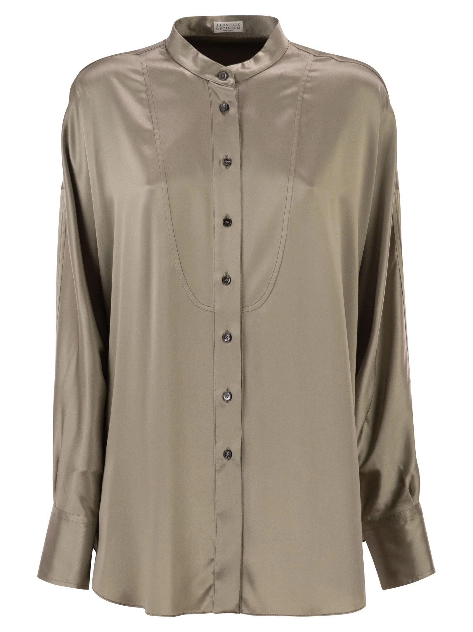 Feminine and elegant, this stretch silk satin shirt is embellished with iconic details from the Brunello Cucinelli collections. The characteristic fluid and iridescent texture of the fabric accompanies the soft lines of the garment, featuring a mandarin collar and slightly wide sleeves. A sparkling bead embroidery at the back of the neck adds a delicate touch of light. An elegant fabric with a shiny effect and a smooth feel, stretch silk satin is a classic among Brunello Cucinelli's fine materials. A small percentage of synthetic fibre enhances comfort. - Placket closure with mother-of-pearl buttons - Mandarin collar - Cuffs with one mother-of-pearl button - Nickel-free jewel decoration DESIGNER ID: M0C59MY906 C9125 96% Silk, 4% Elastane Application Eco finish brass Size Type: INT SKU: M0C59MY906C9125 Our Products Are 100% Genuine. In All Cases We Stand By The Authenticity Of Every Product Sold On Our Site. All sales are final and we only accept returns for quality issue. Buyer is responsible for any import tax/duty if applicable.