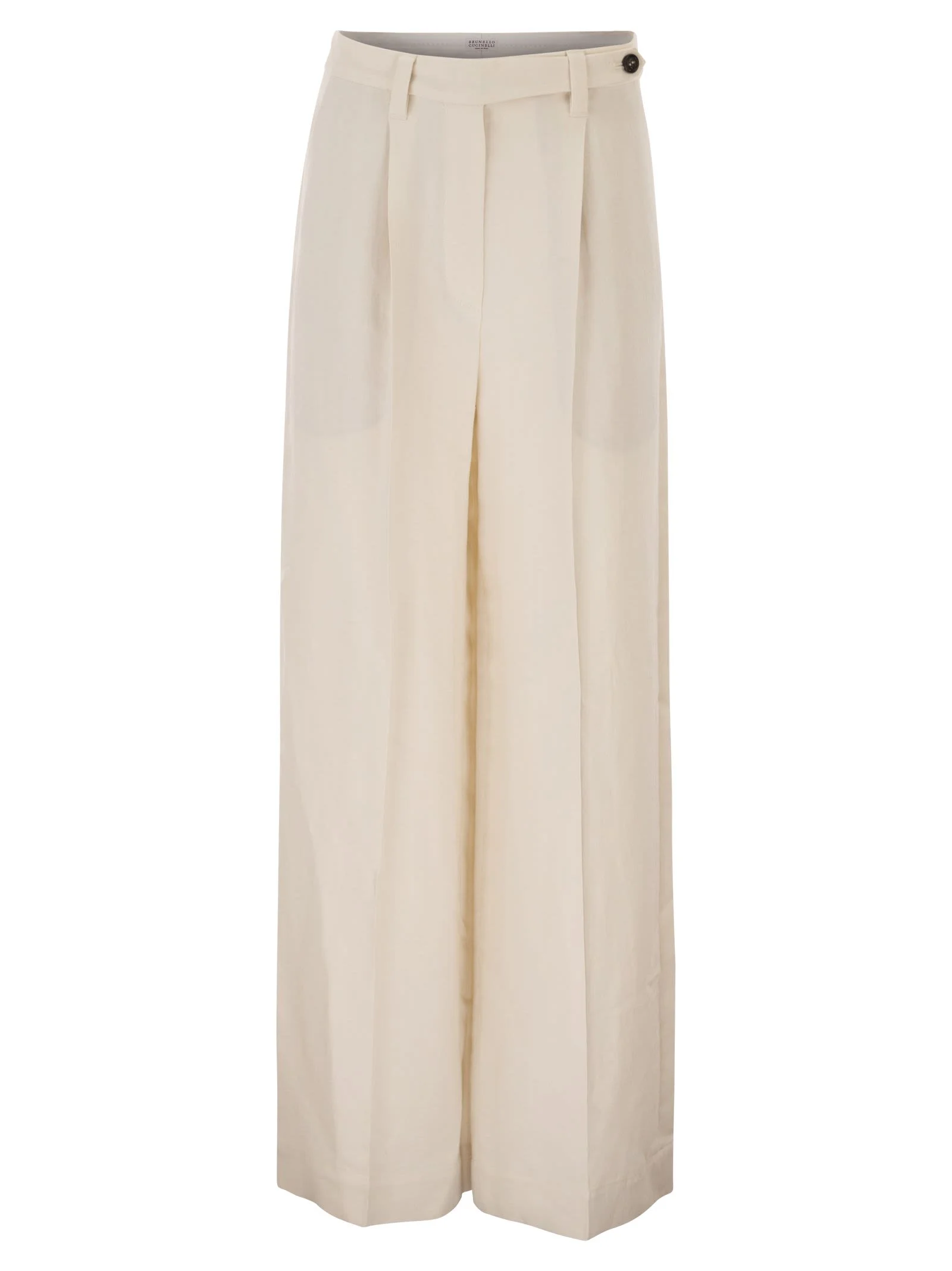 The relaxed elegance of Brunello Cucinelli materials defines the style of these tailored trousers. The viscose and linen Fluid twill offers an extremely smooth and soft feel, capable of following movement naturally. The design is enriched by the presence of double pleats that expand the volume at the hips, while the leg falls smoothly to the bottom, creating a sophisticated and contemporary silhouette. The attention to detail is sealed by the internal cotton waistband and horn buttons, which reflect the garment's high-quality craftsmanship. - Zip fastening with hook and button - Double pleats - Front “America” pockets - Back welt pockets with button - Internal cotton waistband - Brass logo applique with eco finish - Belt loops DESIGNER ID: MH126P9138 C579 72% Viscose, 28% Linen Lining: 36% Polyester, 32% Acetate, 32% Cupro Accessory details: Inner strap: 100% Cotton Application: Brass with Eco finish Size Type: IT SKU: MH126P9138C579 Our Products Are 100% Genuine. In All Cases We Stand By The Authenticity Of Every Product Sold On Our Site. All sales are final and we only accept returns for quality issue. Buyer is responsible for any import tax/duty if applicable.