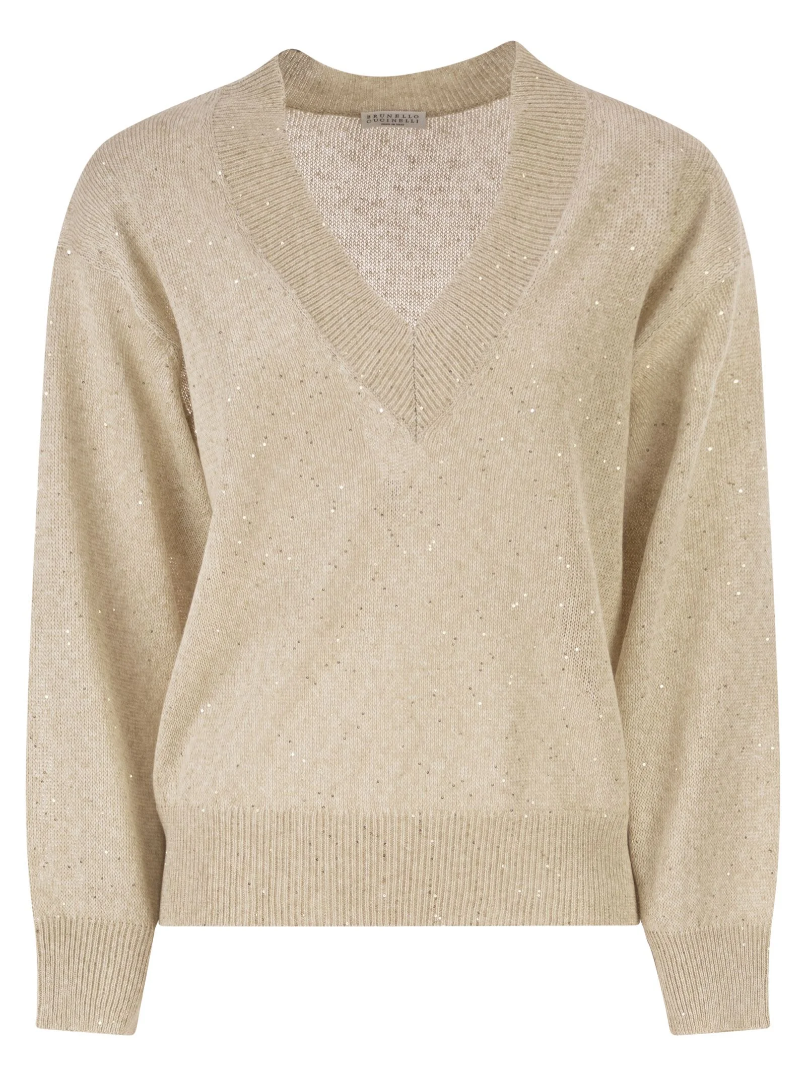 The discreet charm of Brunello Cucinelli luxury is expressed in this long-sleeved jumper, where natural material meets a soft luminosity. The linen and cotton yarn offers a distinctive texture, fresh and slightly slubbed, ideal for the seasonal transition. The design is embellished with a shower of small sequins skilfully integrated into the weave, which capture the light with every movement for a sophisticated yet understated effect. The soft line and deep V-neck give the garment a relaxed allure, making it a versatile wardrobe staple that can elevate an everyday look with a touch of precious craftsmanship. - V-neck with wide ribbed edging - Stockinette knit with integrated shiny sequins - Dropped shoulder - Ribbed knit cuffs and hem - Long sleeves with soft volume DESIGNER ID: MDT746412 C8925 94% Linen, 6% Cotton Sequins: 100% Polyester Size Type: INT SKU: MDT746412C8925 Our Products Are 100% Genuine. In All Cases We Stand By The Authenticity Of Every Product Sold On Our Site. All sales are final and we only accept returns for quality issue. Buyer is responsible for any import tax/duty if applicable.