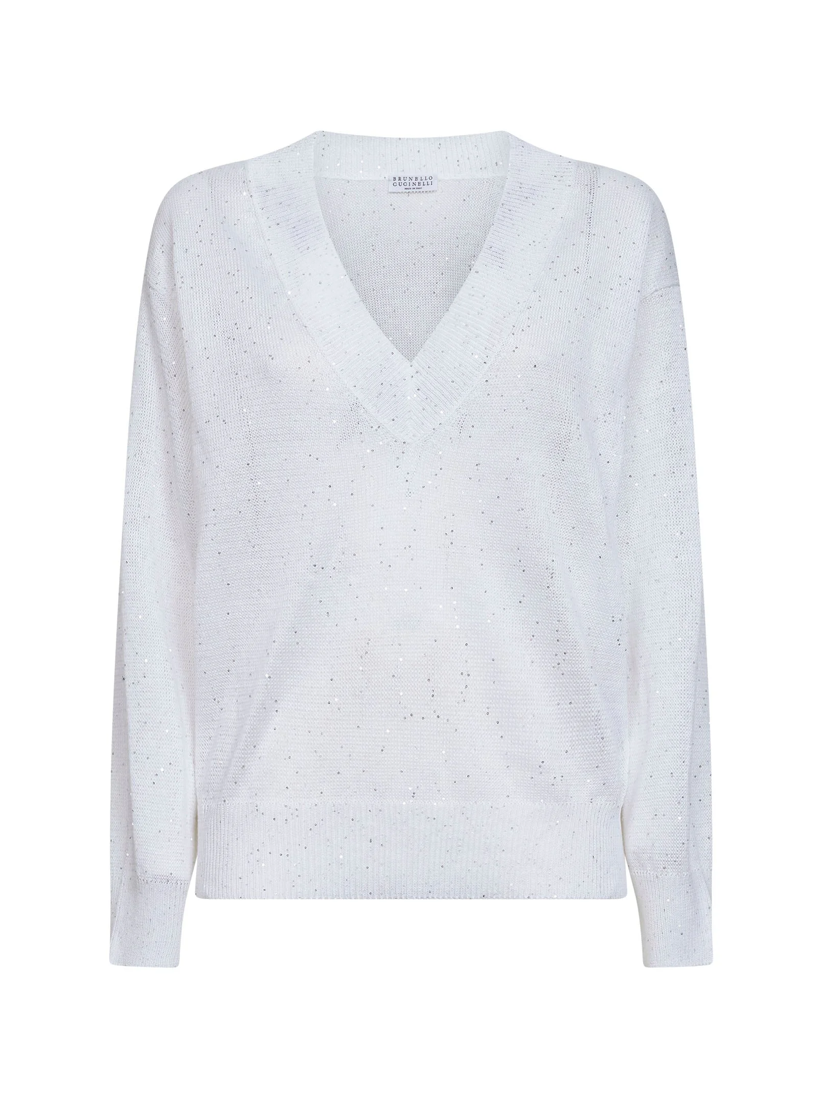 Brunello Cucinelli Women White Sequin Linen And Cotton V-Neck Sweater