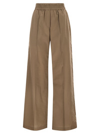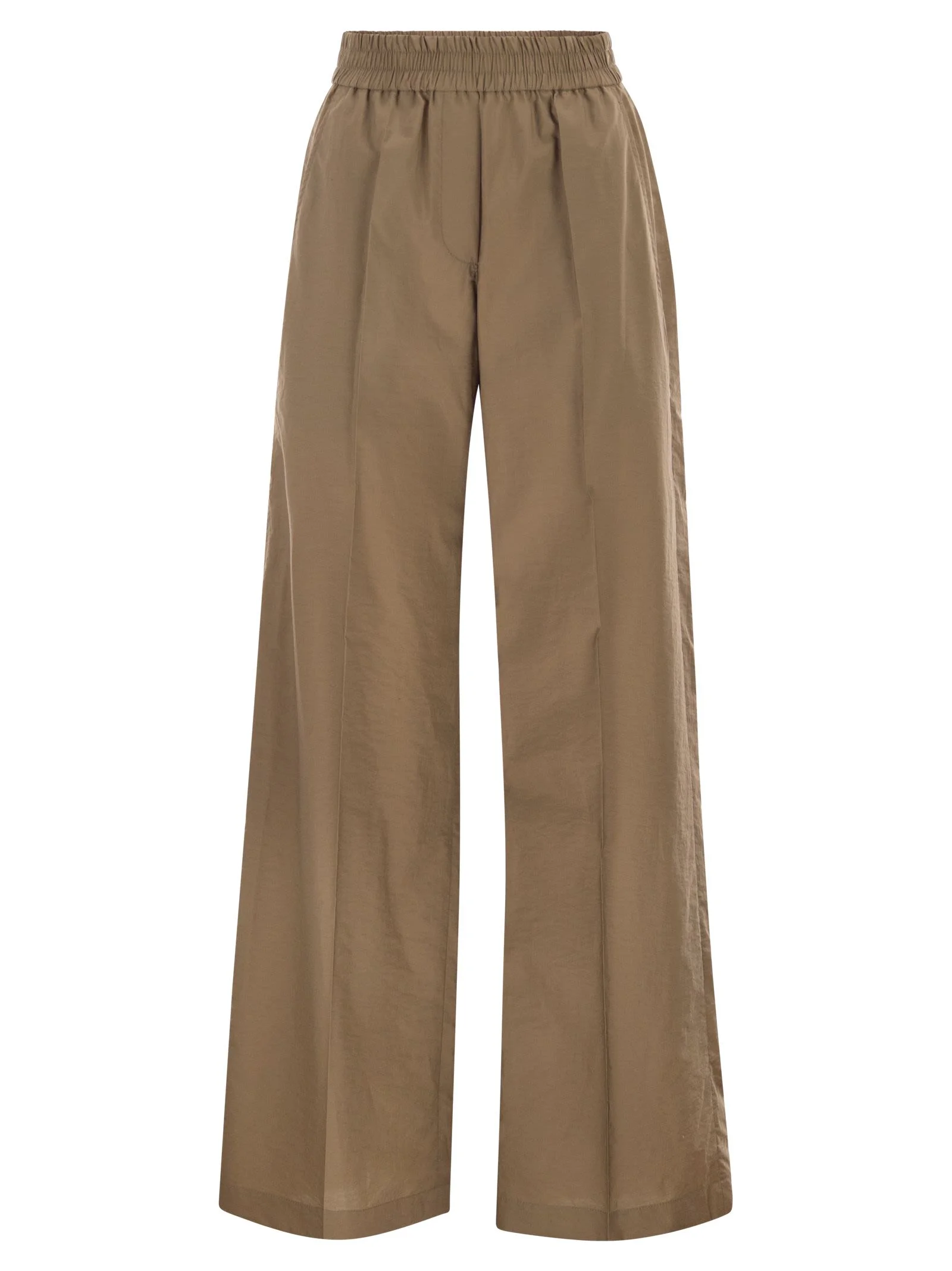 Brunello Cucinelli's aesthetic interprets comfort in a refined way with these wide-leg trousers. The fabric, a lightweight cotton and nylon poplin, offers a smooth and fluid feel, ideal for accompanying movements with extreme lightness. The design features an elasticated waist with gathering that makes them easy to wear and enhances the silhouette, while the wide leg with a subtle centre crease adds a touch of casual elegance. A versatile garment that combines the technicality of nylon with the naturalness of cotton. - Elasticated waistband with gathering - Side pockets inserted into the seam - Wide, straight leg - Pressed centre crease - Simple wide hem - Brass applique detail with eco finish DESIGNER ID: M0F79P9131 C9266 75% Cotton, 25% Polyamide (Nylon) Lining: 65% Acetate, 35% Polyester Accessory details: Application: Brass with Eco finish Size Type: IT SKU: M0F79P9131C9266 Our Products Are 100% Genuine. In All Cases We Stand By The Authenticity Of Every Product Sold On Our Site. All sales are final and we only accept returns for quality issue. Buyer is responsible for any import tax/duty if applicable.