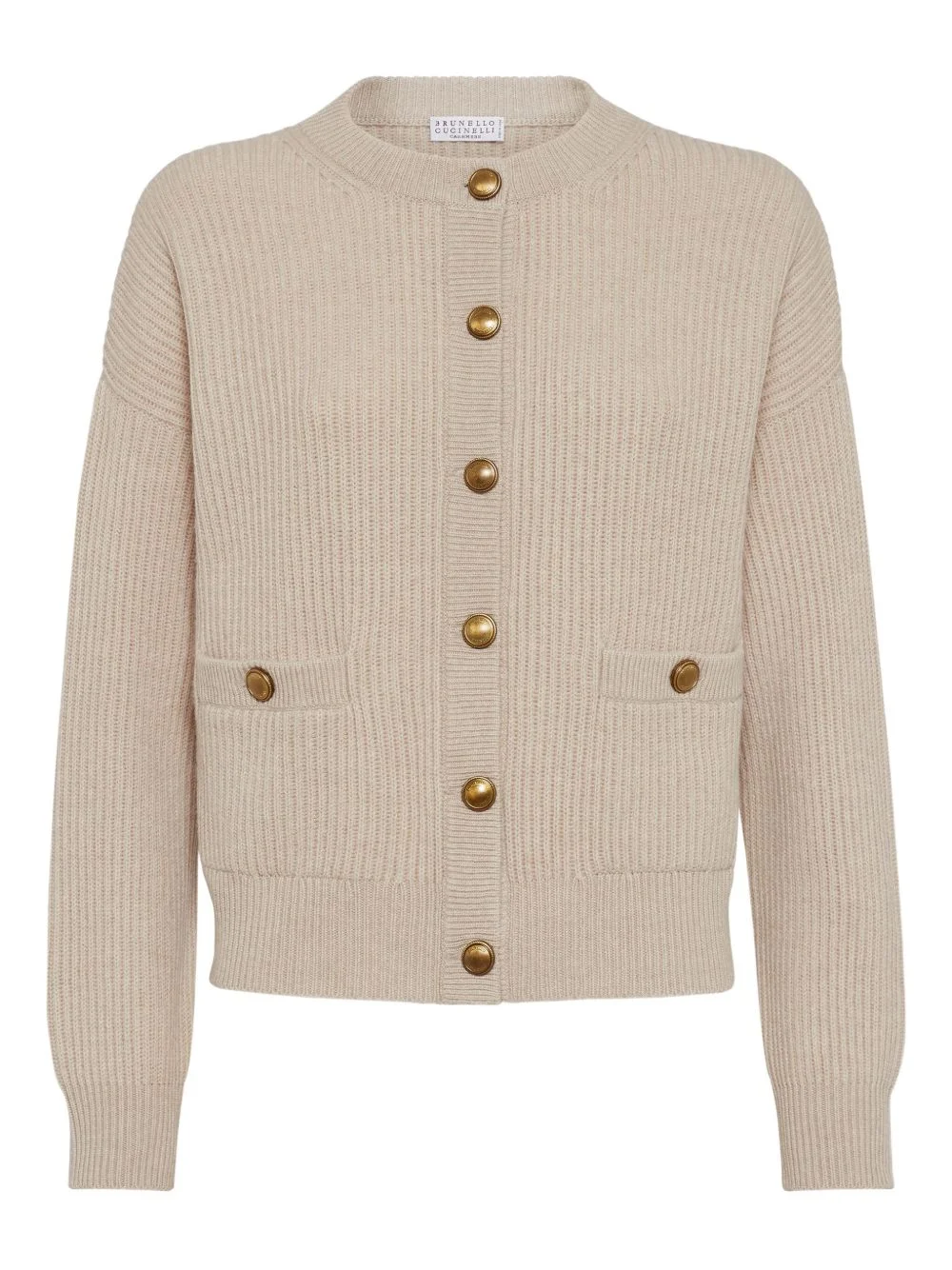 Virgin wool, cashmere and silk English rib cardigan with metal buttons