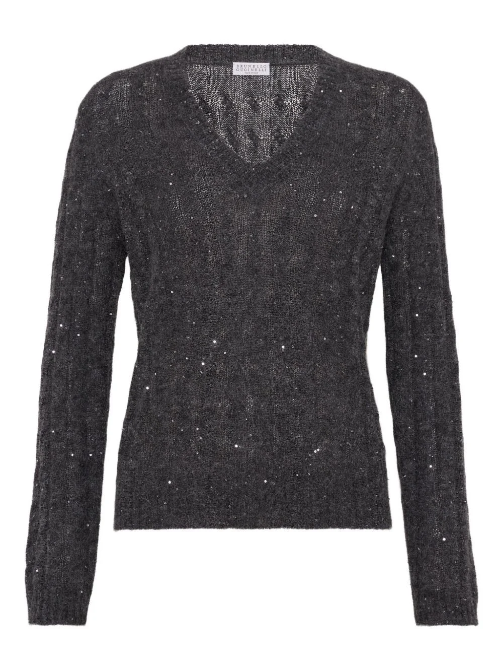 DESCRIPTION ::BRUNELLO CUCINELLI anthracite grey cable knit wool sweater with glitter, V-neck and ribbed edgesMADE IN::ItalyCOLOR::GREY SKU: MPG731302C3595GREY Our Products Are 100% Genuine. In All Cases We Stand By The Authenticity Of Every Product Sold On Our Site. All sales are final and we only accept returns for quality issue. Buyer is responsible for any import tax/duty if applicable.