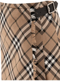 The Burberry wool-blend mini kilt with iconic Burberry Check is a distinctive and versatile piece for a fashionable women's wardrobe. The classic design is embellished with modern details and craftsmanship, perfect for adding an elegant and iconic touch to your everyday outfit. || - Side button closure with B-shaped buckle. - Short, subtle fringing along the edges - Regular fit. This garment fits true to size; we recommend you choose your usual size - Made in Scotland from a wool blend with Burberry Check - Pleats at back and leather strap with B-shaped buckle || For a chic and charming look, pair the mini kilt with an oversized sweater and leather ankle boots. Add a shoulder bag for a practical touch and a long coat for a sophisticated outfit. For an elegant occasion, a white shirt and pumps will complete your look perfectly. 55% polyester 45% wool SKU: 8095396 Our Products Are 100% Genuine. In All Cases We Stand By The Authenticity Of Every Product Sold On Our Site. All sales are final and we only accept returns for quality issue. Buyer is responsible for any import tax/duty if applicable.
