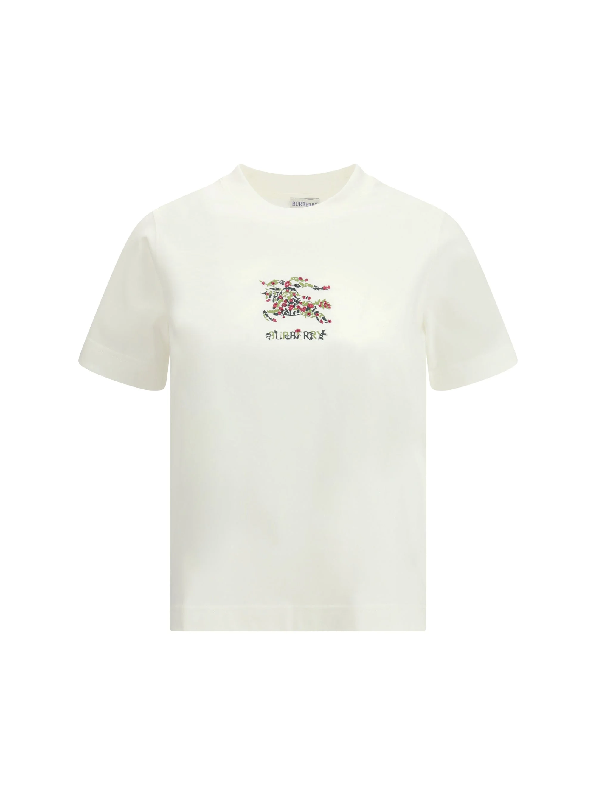 The printed T-shirt by Burberry in white embodies the essence of contemporary elegance expressed through a classic silhouette. The regular fit with short sleeves and a subtle crew neck highlights refined simplicity, while the smooth, carefully selected cotton ensures exceptional comfort and a soft, premium feel. The chest features an intricate embroidery depicting a horseman surrounded by floral motifs, including leaves and flowers in shades of green, pink, and red. Beneath the artwork, the finely embroidered BURBERRY lettering stands out, symbolizing the heritage and impeccable style of the iconic fashion house. Size Type: INT SKU: 8118964B7078 Our Products Are 100% Genuine. In All Cases We Stand By The Authenticity Of Every Product Sold On Our Site. All sales are final and we only accept returns for quality issue. Buyer is responsible for any import tax/duty if applicable.