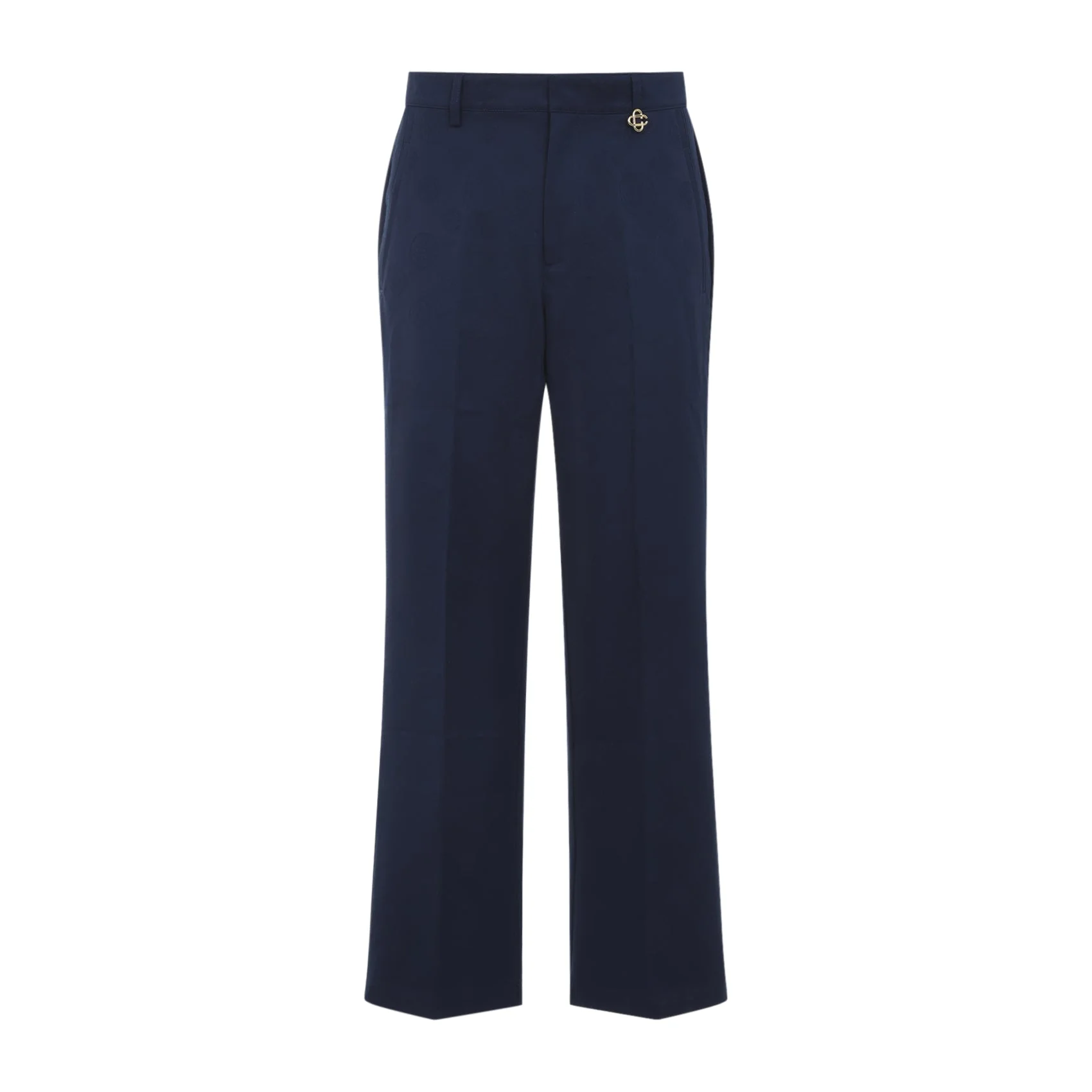 Casablanca Monogram Navy Blue Cotton Pants. Chino pants crafted from blue cotton with an all-over signature monogram jacquard, it features belt loops, a front concealed fastening, a gold-toned metal plaque logo on the front, side pockets, welt pockets at the back, and a straight leg. Cotton | 100%COTTON Size Type: IT SKU: MSP26TR37902Blue Our Products Are 100% Genuine. In All Cases We Stand By The Authenticity Of Every Product Sold On Our Site. All sales are final and we only accept returns for quality issue. Buyer is responsible for any import tax/duty if applicable.
