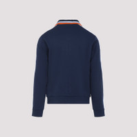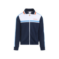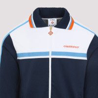 Casablanca Navy Blue Track Jacket. Crafted in polyamide, viscose and elastane blend. Pointed ribbed collar, front zipped fastening, chest orange embroidered logo, side pockets, long sleeves, straight hem. White and orange stripe details on the collar. White and light blue details on the sleeves and on the front. Polyamide | 51%POLYAMIDE 46%VISCOSE 3%ELASTANE Size Type: INT SKU: MPF25JTP39101Blue Our Products Are 100% Genuine. In All Cases We Stand By The Authenticity Of Every Product Sold On Our Site. All sales are final and we only accept returns for quality issue. Buyer is responsible for any import tax/duty if applicable.
