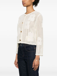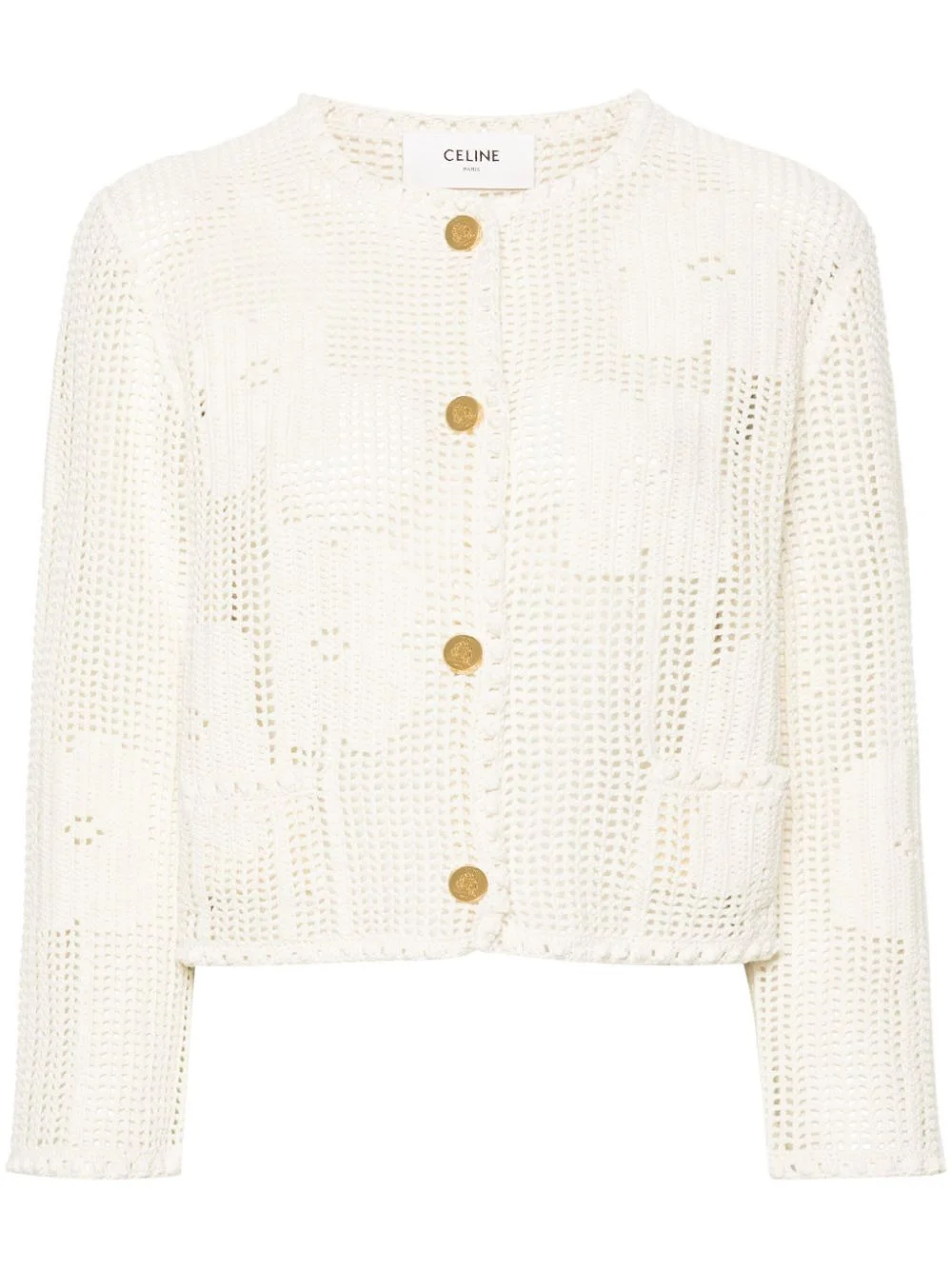 off-white cotton open knit 3D knit trim crew neck long sleeves two front patch pockets unlined straight hem embossed gold-tone buttons front button fastening Size Type: INT SKU: 2AE4T845X01OW Our Products Are 100% Genuine. In All Cases We Stand By The Authenticity Of Every Product Sold On Our Site. All sales are final and we only accept returns for quality issue. Buyer is responsible for any import tax/duty if applicable.