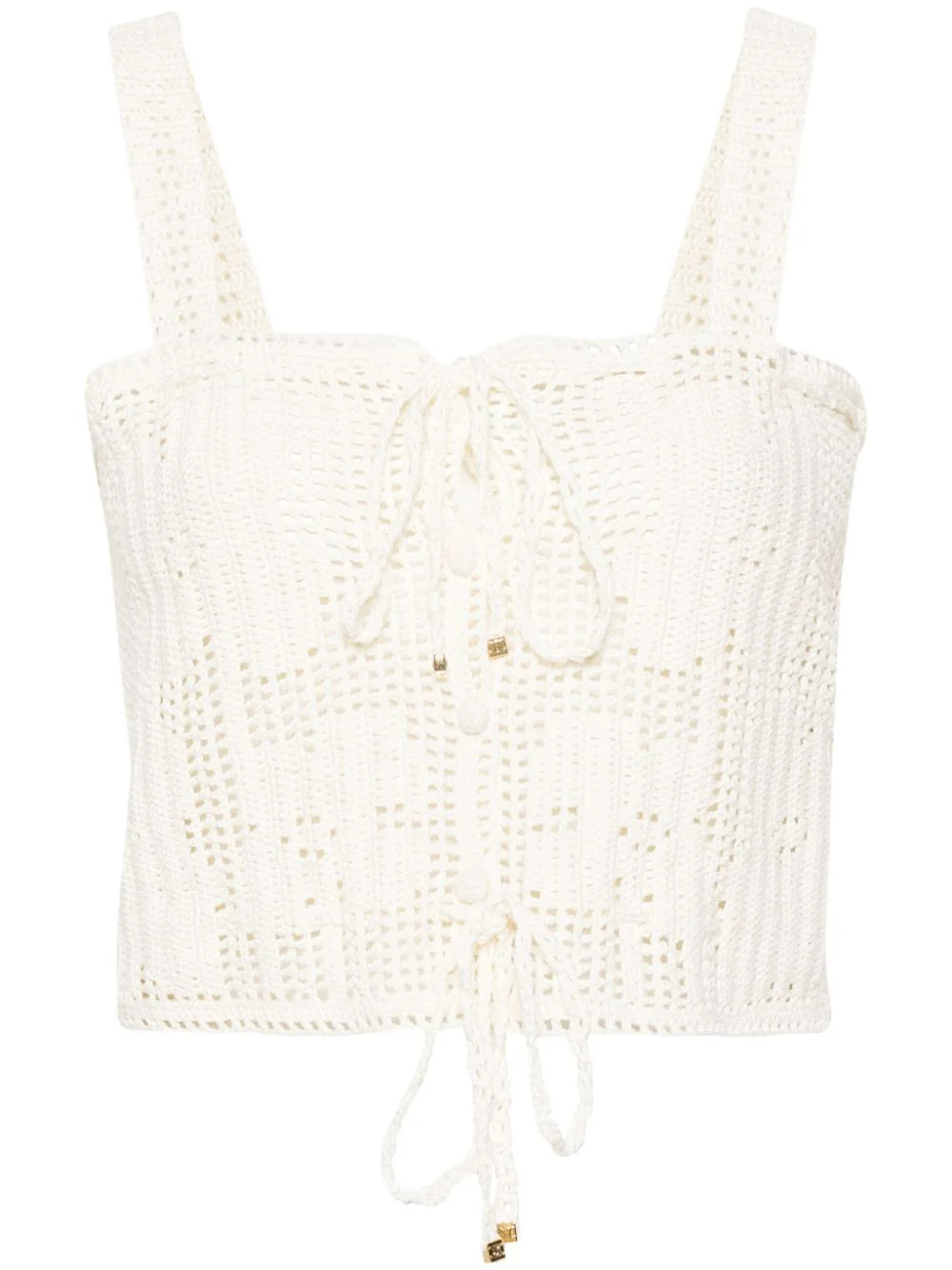 off-white cotton open knit thin straps sleeveless square neck drawstring fastening cropped unlined straight hem front button fastening Size Type: INT SKU: 2AE7M845X01OW Our Products Are 100% Genuine. In All Cases We Stand By The Authenticity Of Every Product Sold On Our Site. All sales are final and we only accept returns for quality issue. Buyer is responsible for any import tax/duty if applicable.
