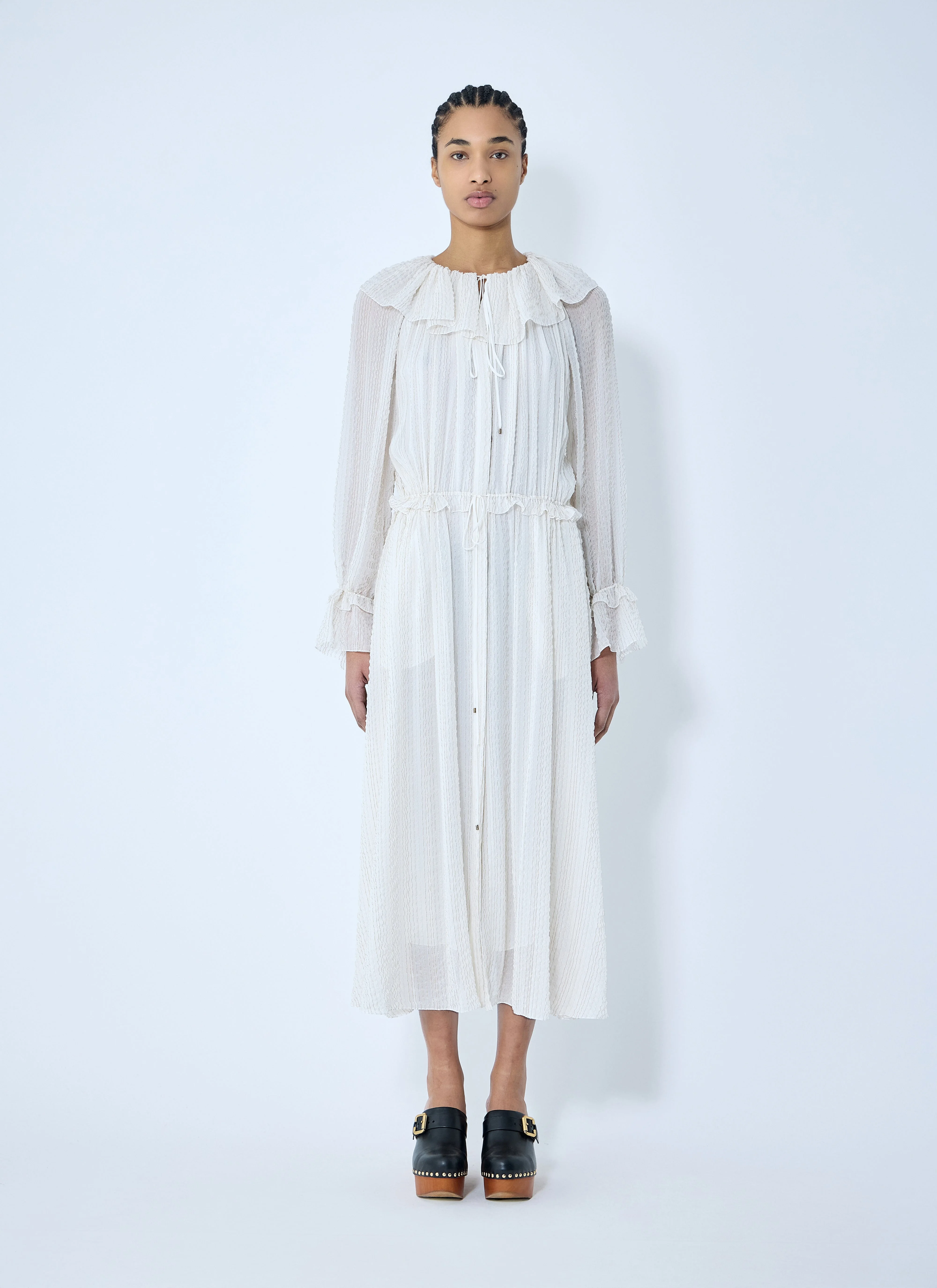 Gathered maxi dress in silk crepon with lurex stripes. V neck with self-tie fastening Long sleeves Drawstring waistline Button fastening cuffs Detachable lining 77% Silk, 23% Polyester. Dry clean CH25SRO24296 113 SKU: CH25SRO24296113 Our Products Are 100% Genuine. In All Cases We Stand By The Authenticity Of Every Product Sold On Our Site. All sales are final and we only accept returns for quality issue. Buyer is responsible for any import tax/duty if applicable.