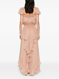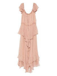 GATHERED LONG RUFFLED DRESS IN SILK MOUSSELINE
