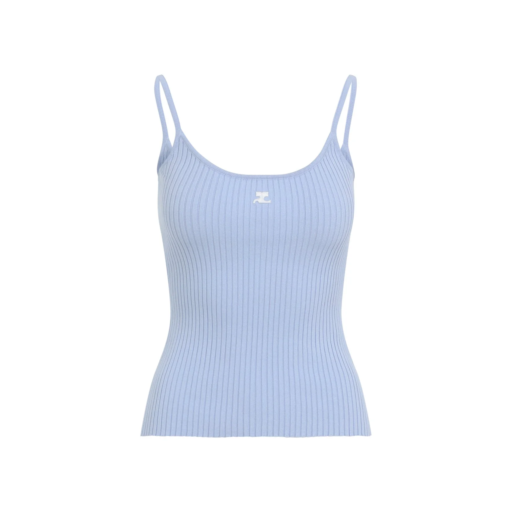 Courreges Pastel Blue Rib Knit Tank Top. Crafted in a pastel blue viscose and tech fabric. Scoop neck, spaghetti straps, ribbed look, contrasting "AC" logo on the front, straight hem. Viscose | 70%VISCOSE 30%POLYESTER Size Type: INT SKU: PERMDE012FI0001Blue Our Products Are 100% Genuine. In All Cases We Stand By The Authenticity Of Every Product Sold On Our Site. All sales are final and we only accept returns for quality issue. Buyer is responsible for any import tax/duty if applicable.