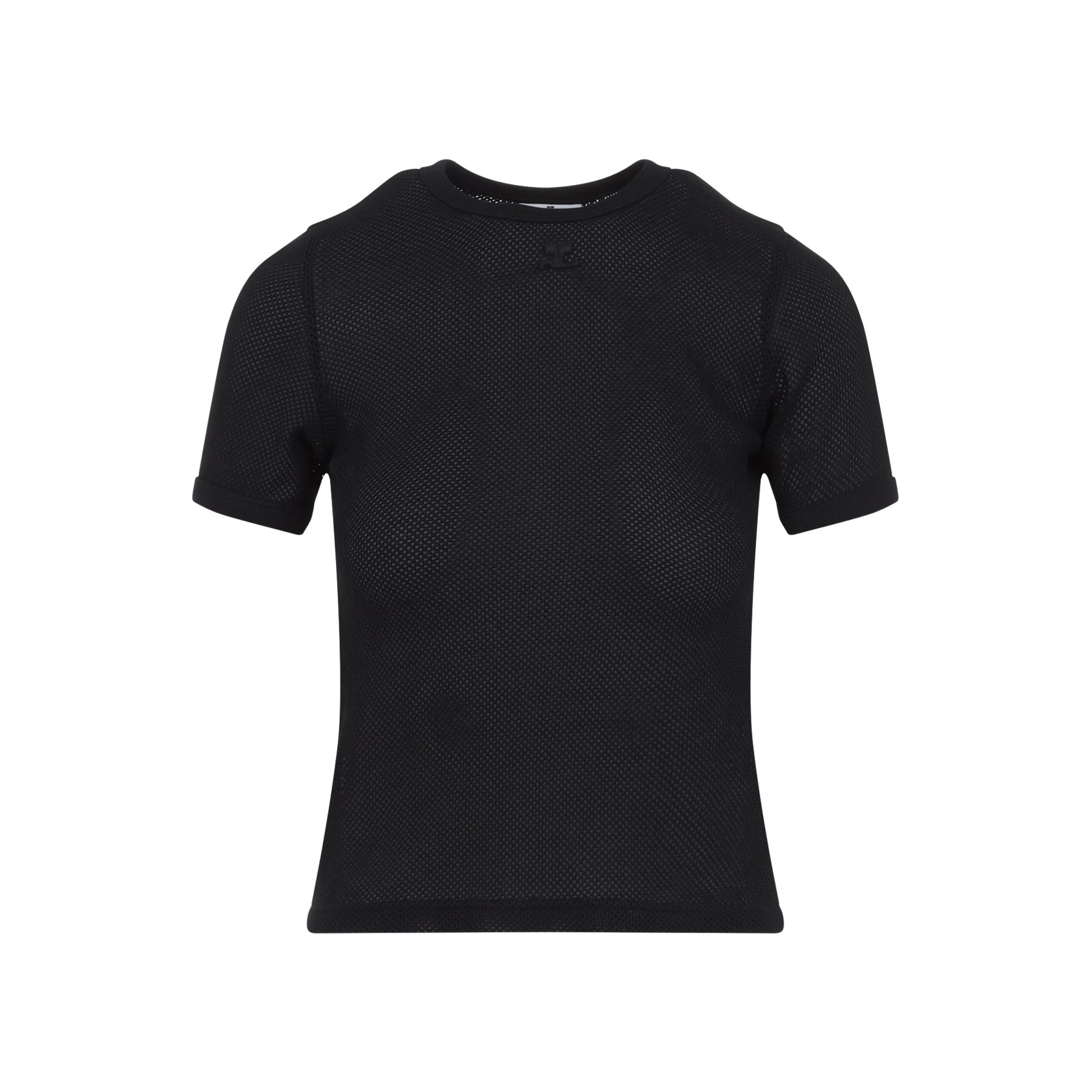 Courreges Signature Contrast Black Polyester T-shirt. Black fine mesh, round neckline, short sleeves, tonal logo embroidery on the front, straight hem, ribbed collar and cuffs. Polyester | 52%POLYESTER 48%COTTON Size Type: INT SKU: 125JTS017JS0069Black Our Products Are 100% Genuine. In All Cases We Stand By The Authenticity Of Every Product Sold On Our Site. All sales are final and we only accept returns for quality issue. Buyer is responsible for any import tax/duty if applicable.