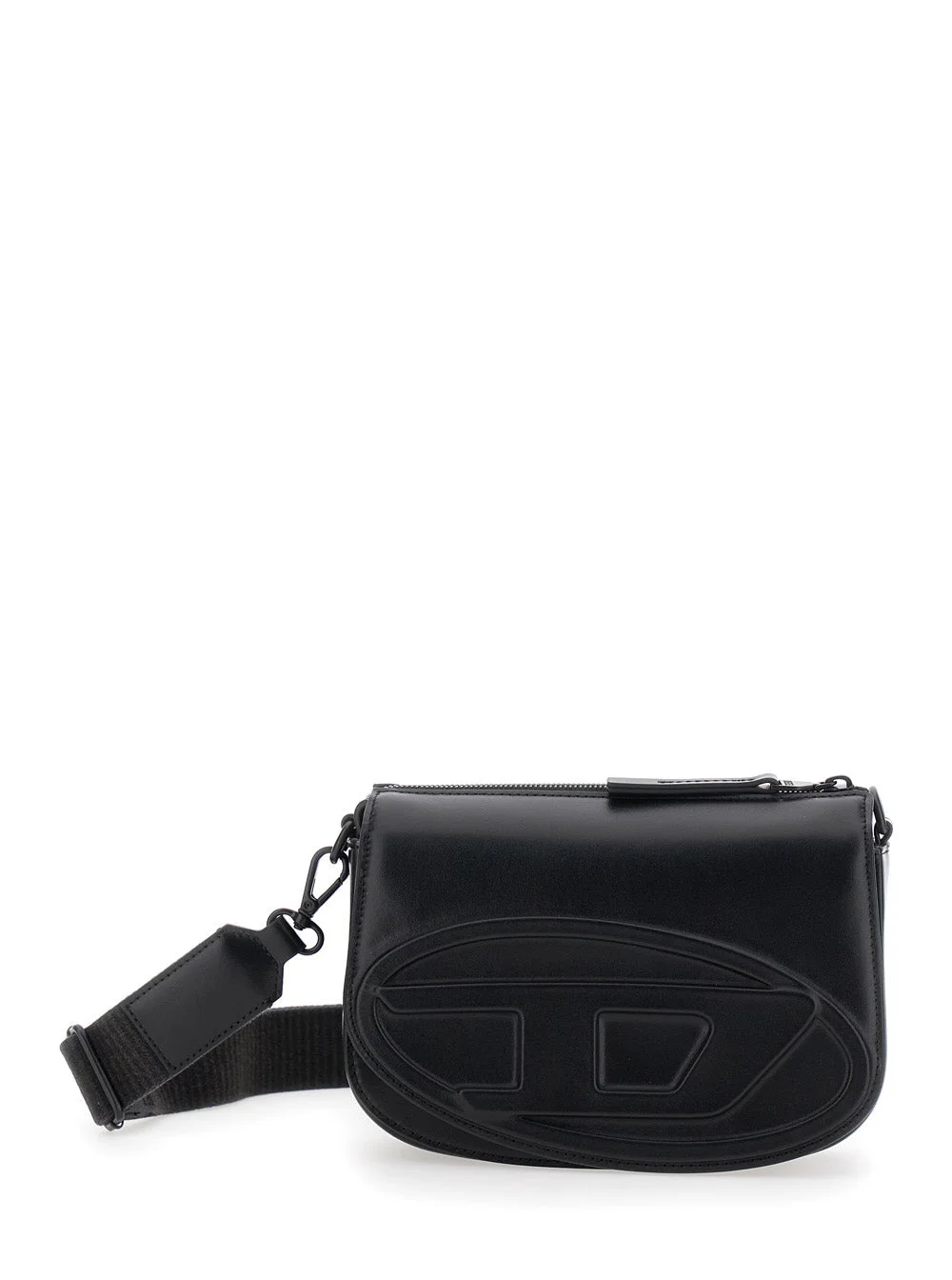 Diesel Men '1Dr' Black Crossbody Bag With Oval D Logo Embroidery On The Front In Leather Man