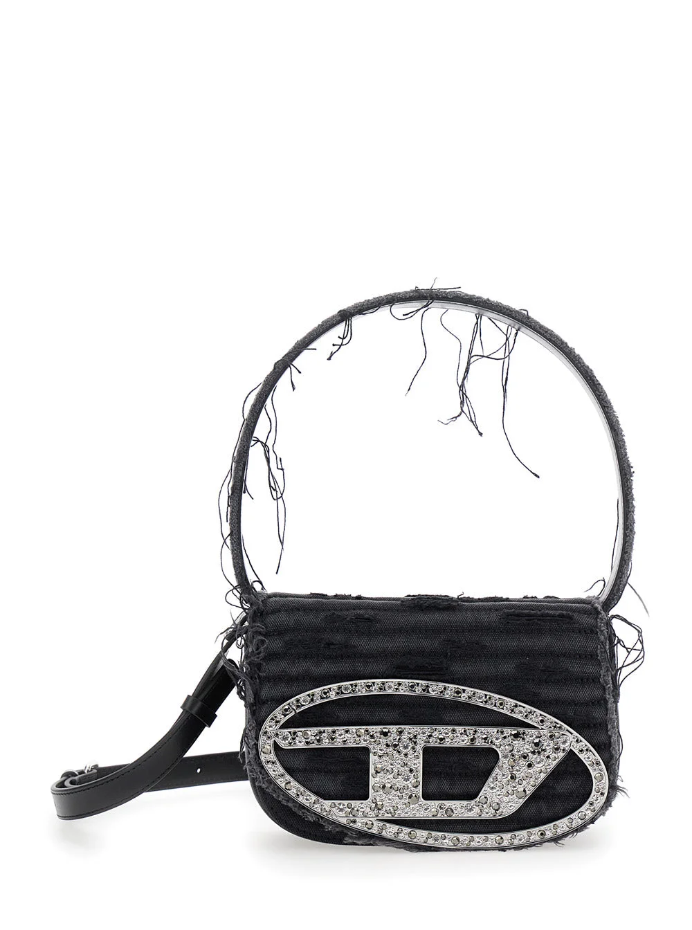 Diesel Women '1Dr' Black Shoulder Bag With Oval D Plaque With Rhinestones And Fringed Edges In Cotto