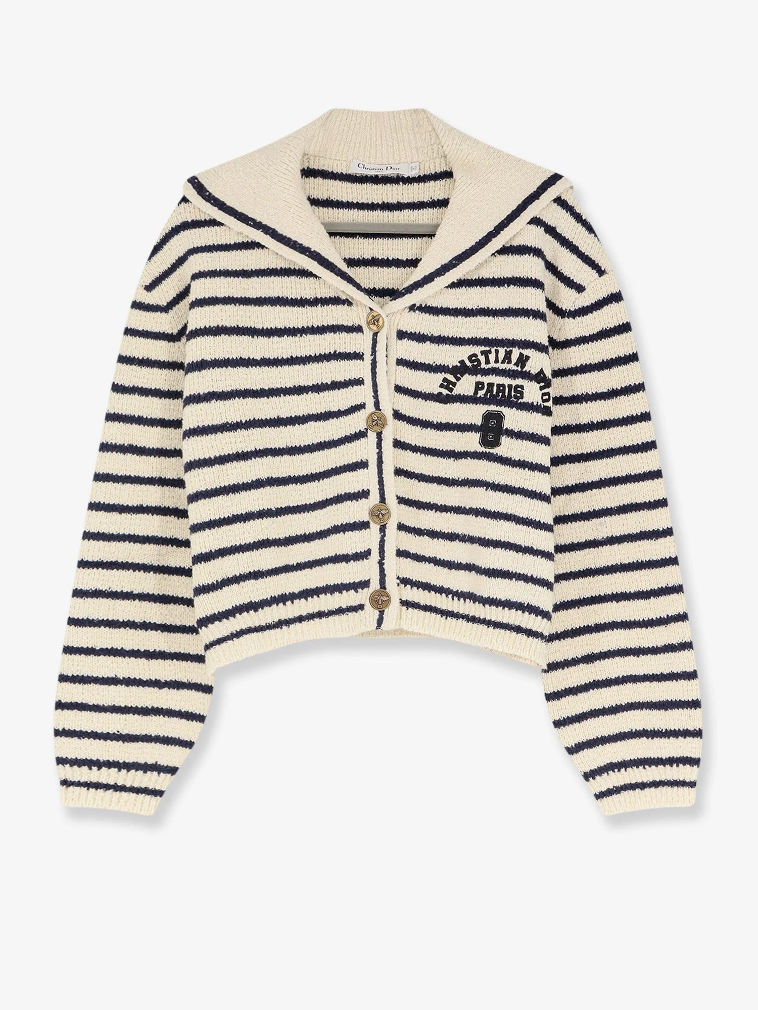Brand: DIOR Product reference:614G13A7108 Color reference:0883 Color:Blue Season:26P Gender:Woman Category 1:Abbigliamento Category 2:Knitwear Made in:ITALIA Christian Dior Paris 8 signature on the front Antique gold-finish metal button closure, bee, and CD signature Sailor collar Made in Italy 100% cotton SKU: 614G13A71080883 Size Type: FR SKU: 614G13A710883 Our Products Are 100% Genuine. In All Cases We Stand By The Authenticity Of Every Product Sold On Our Site. All sales are final and we only accept returns for quality issue. Buyer is responsible for any import tax/duty if applicable.
