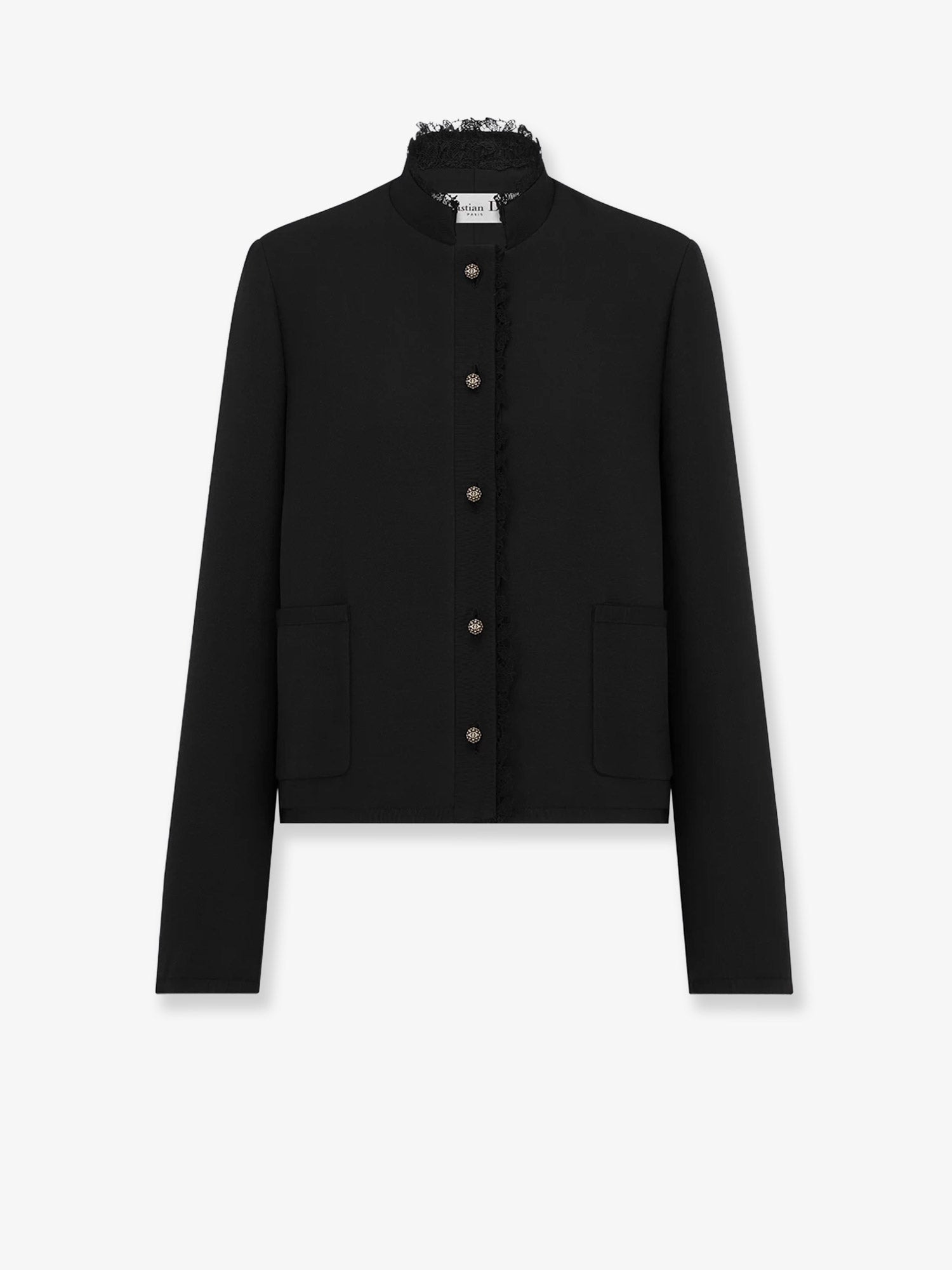 Brand: DIOR Product reference:551V81A1166 Color reference:9000 Color:Black Season:25A Gender:Woman Category 1:Abbigliamento Category 2:Blazer and Gilet Made in:ITALIA Dior Tribales button closure Lace profile Crew-neck Patch pockets with grosgrain profile Made in Italy 77% wool, 23% silk Lining: 100% silk SKU: 551V81A11669000 Size Type: FR SKU: 551V81A1166000 Our Products Are 100% Genuine. In All Cases We Stand By The Authenticity Of Every Product Sold On Our Site. All sales are final and we only accept returns for quality issue. Buyer is responsible for any import tax/duty if applicable.