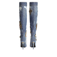 Denim boots with embroidery and stones