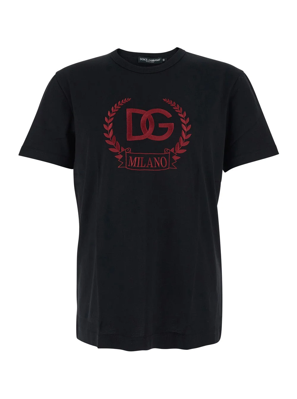 Dolce & Gabbana Men Black Crewneck T-Shirt With Logo Embroidery On The Front In Cotton Man