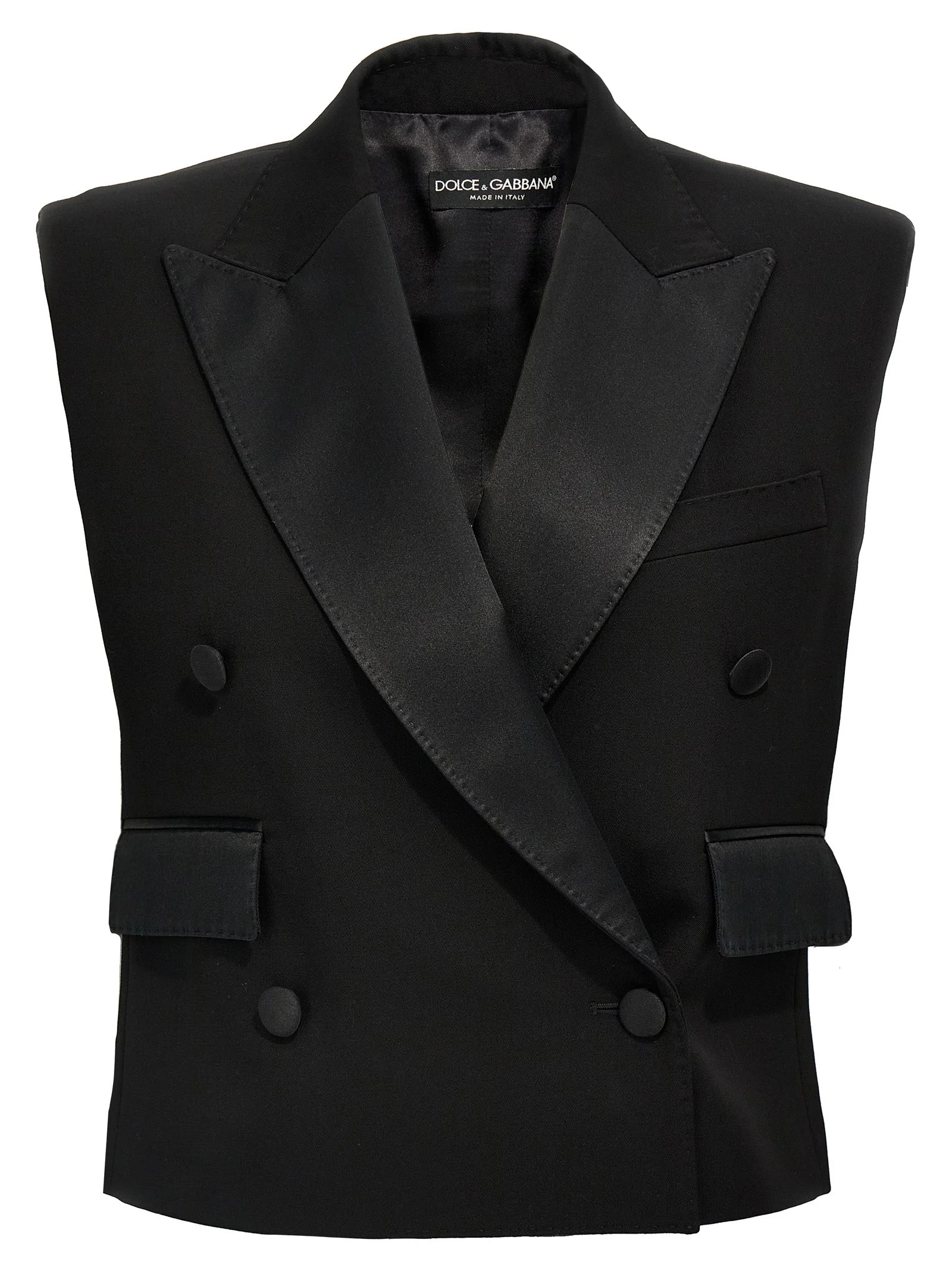 Sleeveless double-breasted wool gabardine tuxedo jacket