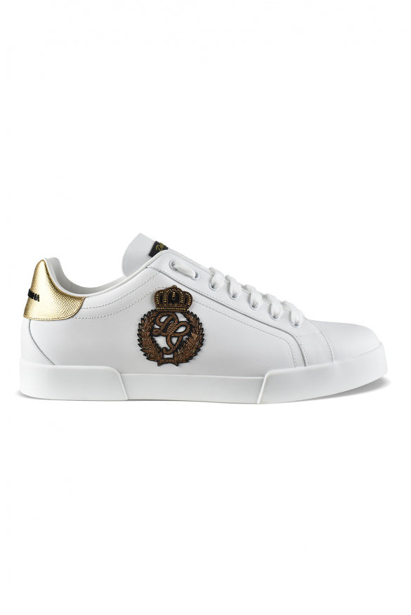 <p>Dolce & Gabbana Portofino low sneakers in white leather. Gold embroidered brand crest on outside. Tongue with logo patch. Gold leather counter with Dolce & Gabbana logo. White lace-up closure. Flat rubber sole. Made in Italy.</p> Size Type: IT SKU: CS1761AH1368I047 Our Products Are 100% Genuine. In All Cases We Stand By The Authenticity Of Every Product Sold On Our Site. All sales are final and we only accept returns for quality issue. Buyer is responsible for any import tax/duty if applicable.