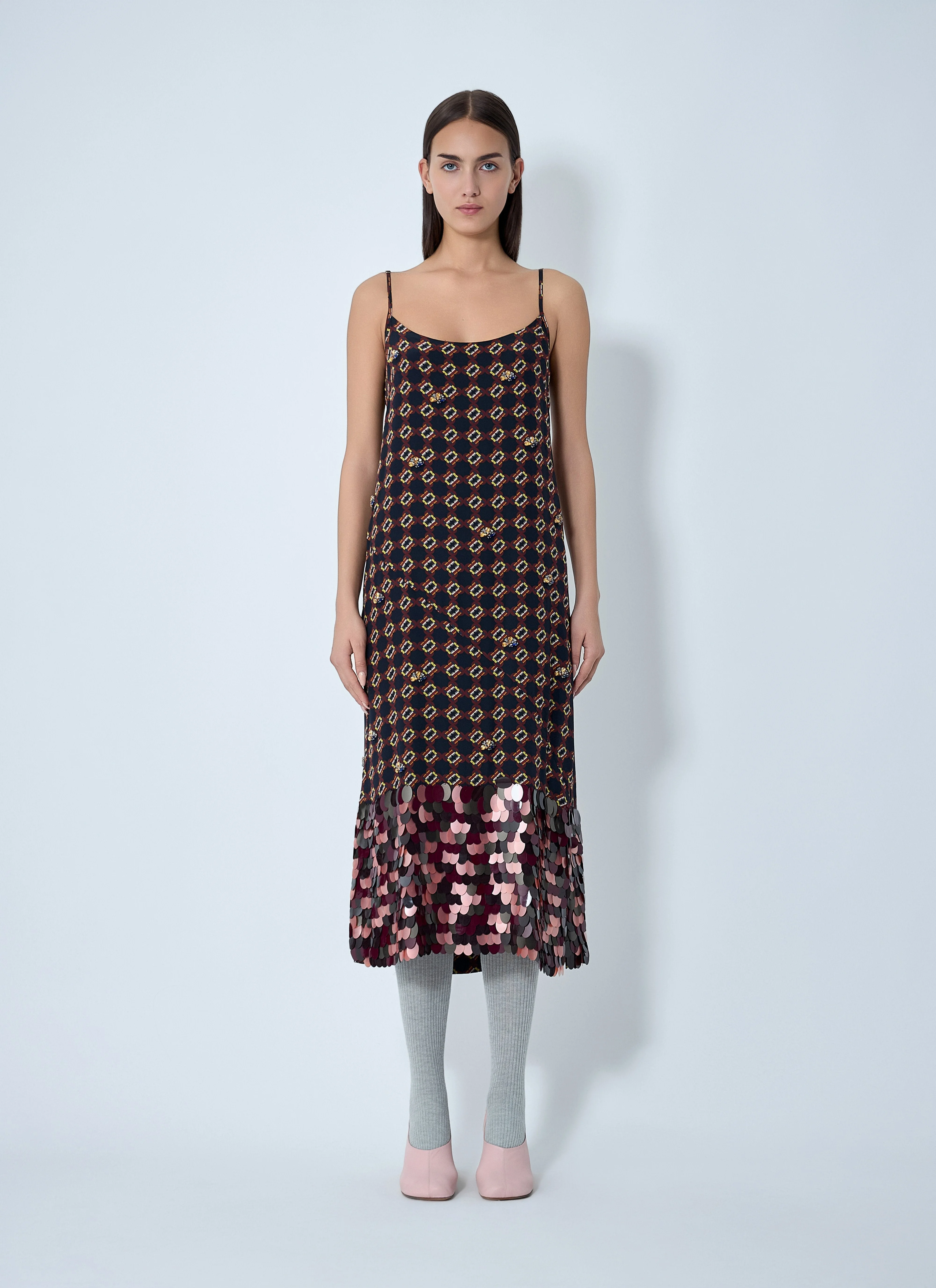 Printed slip dress with sequin embellished trim. Scoop neckline Camisole straps Embelished hem 100% Silk. Dry clean 252-011094-2072-509 SKU: 2520110942072509 Our Products Are 100% Genuine. In All Cases We Stand By The Authenticity Of Every Product Sold On Our Site. All sales are final and we only accept returns for quality issue. Buyer is responsible for any import tax/duty if applicable.