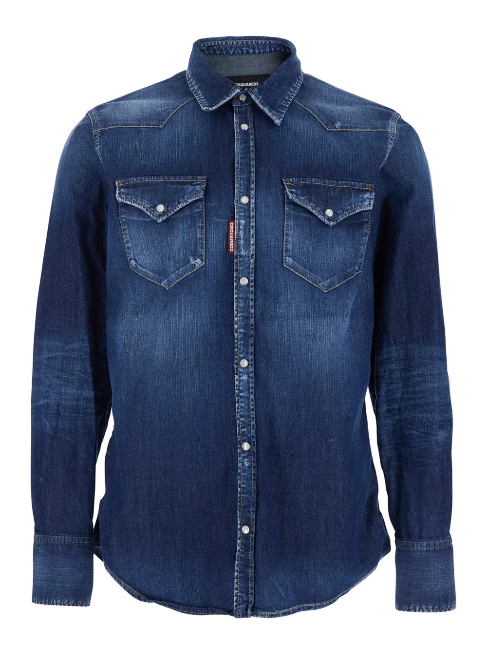 Dsquared2 Men Blue Long-Sleeved Shirt With Classic Collar And Two Front Pockets In Denim Man