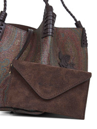 •Inner metal hook and ring fastening •Double long woven leather handle •Leather ETRO and Pegaso logo patch at front •Interior: one main compartment, detachable mini suede pouch with snap-buttoned flap and ETRO logo •Leather threading detailing at top corners •Metal feet •Gold-toned metal hardware •Brown calf leather details •Paisley jacquard canvas design •26 X 19 X 12 cm; handle drop: 28 cm •Brown color •76% Cotton, 24% Polyester •Made in Italy SKU: wp1d0052aa060m0019 Our Products Are 100% Genuine. In All Cases We Stand By The Authenticity Of Every Product Sold On Our Site. All sales are final and we only accept returns for quality issue. Buyer is responsible for any import tax/duty if applicable.