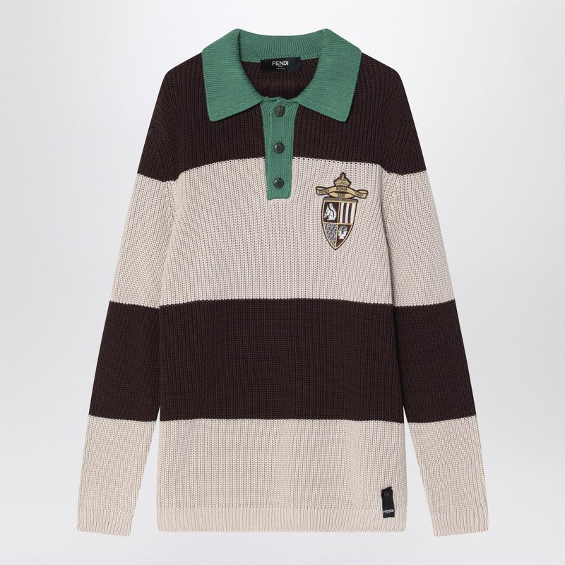 Fendi Knitted Cotton Polo Shirt With Brown And Beige Stripes Men