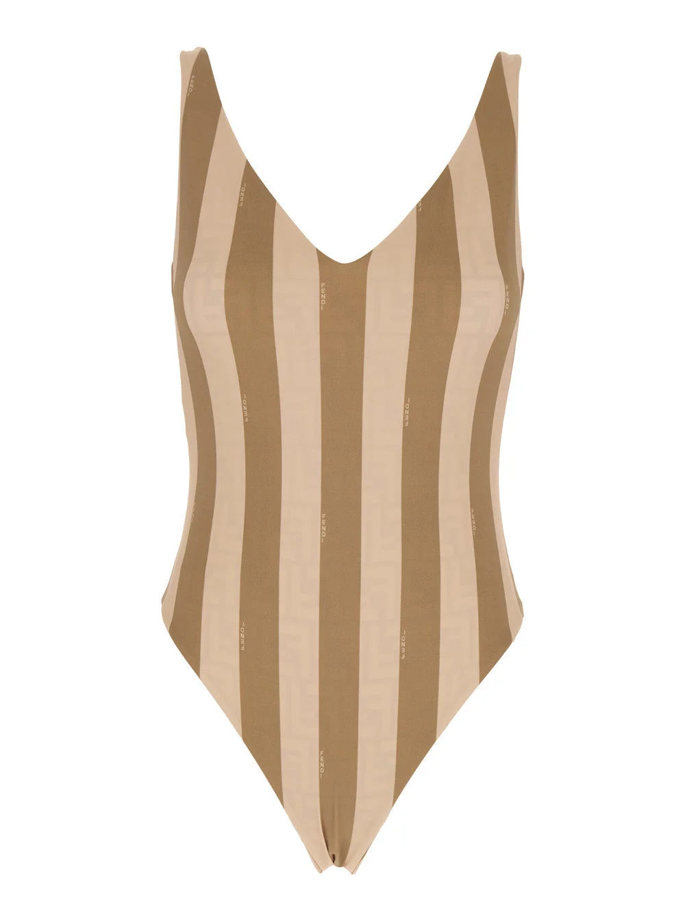 Fendi Women Beige Reversible Swimsuit With V Neck And All-Over Striped Motif In Tech Fabric Stretch