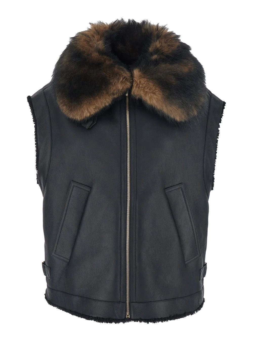 Fendi Women Black Sleeveless Shearling Jacket With Buckled Spread Collar In Leather And Fur Woman