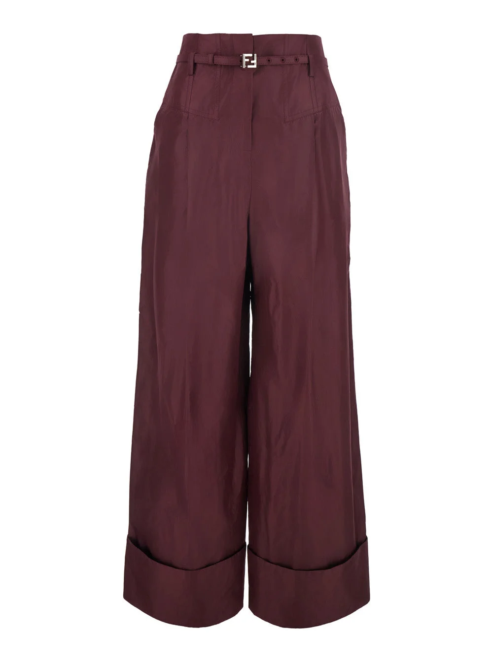 Fendi Women Bordeaux Pants With Ff Buckle Belt And Maxi Turn-Up Hem In Silk Woman