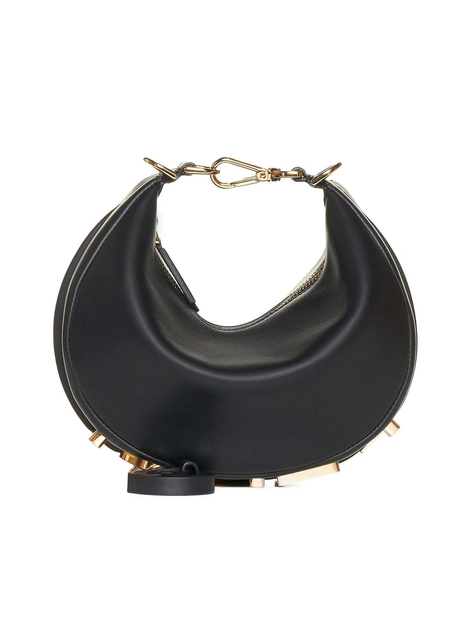 •Mini hobo bag made of soft black leather •Embellished with vintage gold metal FENDI lettering •Zip closure and fabric-lined internal compartment •Gold-finish metal hardware •Thin adjustable and removable shoulder strap •Made in Italy SKU: 8bs081a5dyf1hej Our Products Are 100% Genuine. In All Cases We Stand By The Authenticity Of Every Product Sold On Our Site. All sales are final and we only accept returns for quality issue. Buyer is responsible for any import tax/duty if applicable.
