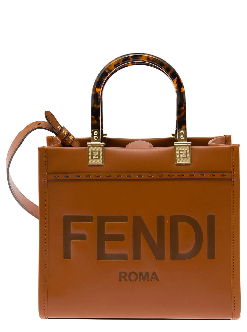 Fendi Women 'Sunshine Small' Brown Tote Bag With Embossed Logo And Tortoiseshell Handles In Leather