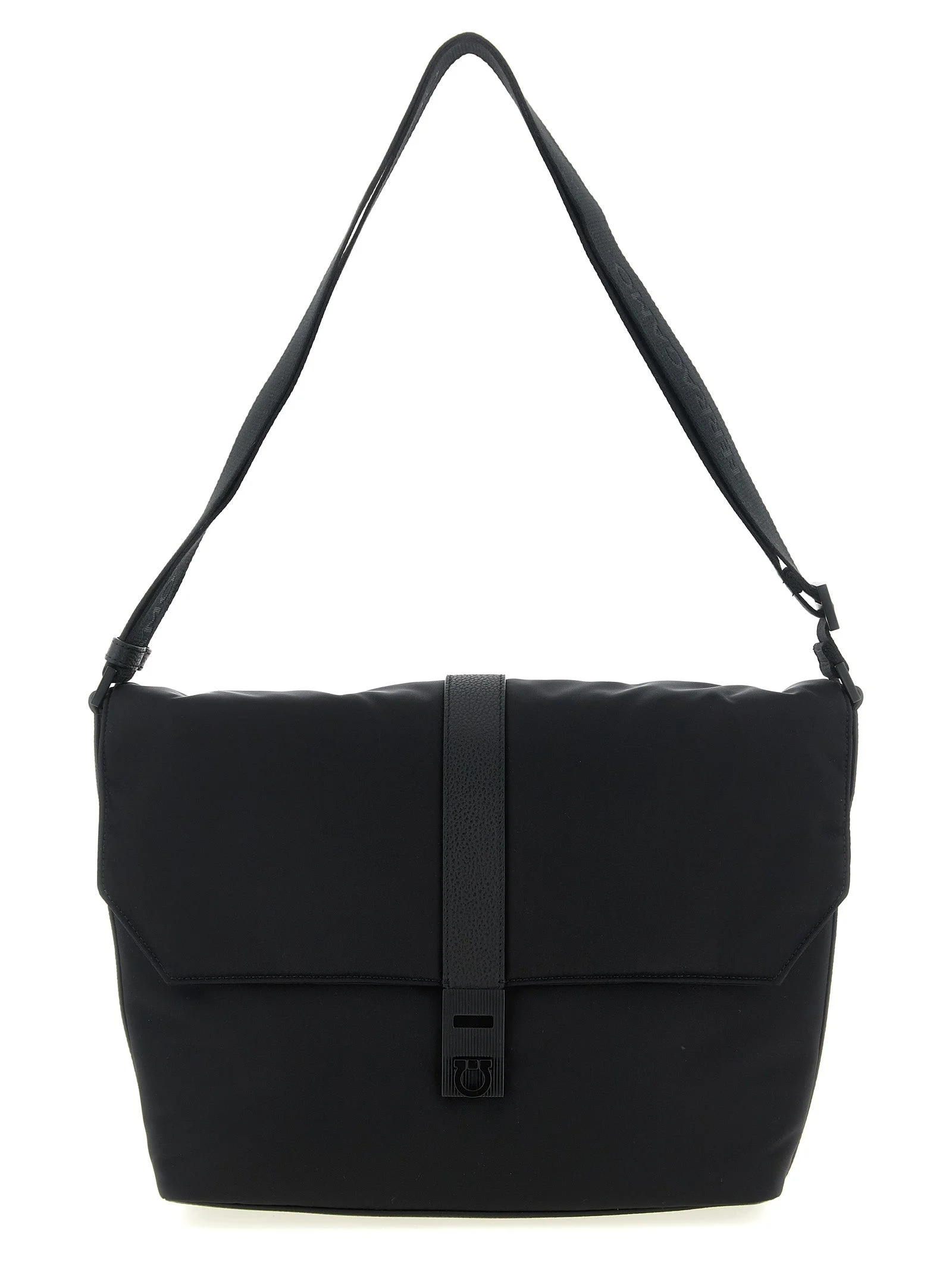 'Twins' crossbody bag in technical fabric and hammered leather, flap closure with tone-on-tone 'Gancini' knurled buckle, zip pocket and band to attach the bag to the back trolley, adjustable shoulder strap in jacquard logo ribbon. W 30 x H 25 x D 13 cm 70% fabric 30% calf leather SKU: 789893NERO Our Products Are 100% Genuine. In All Cases We Stand By The Authenticity Of Every Product Sold On Our Site. All sales are final and we only accept returns for quality issue. Buyer is responsible for any import tax/duty if applicable.