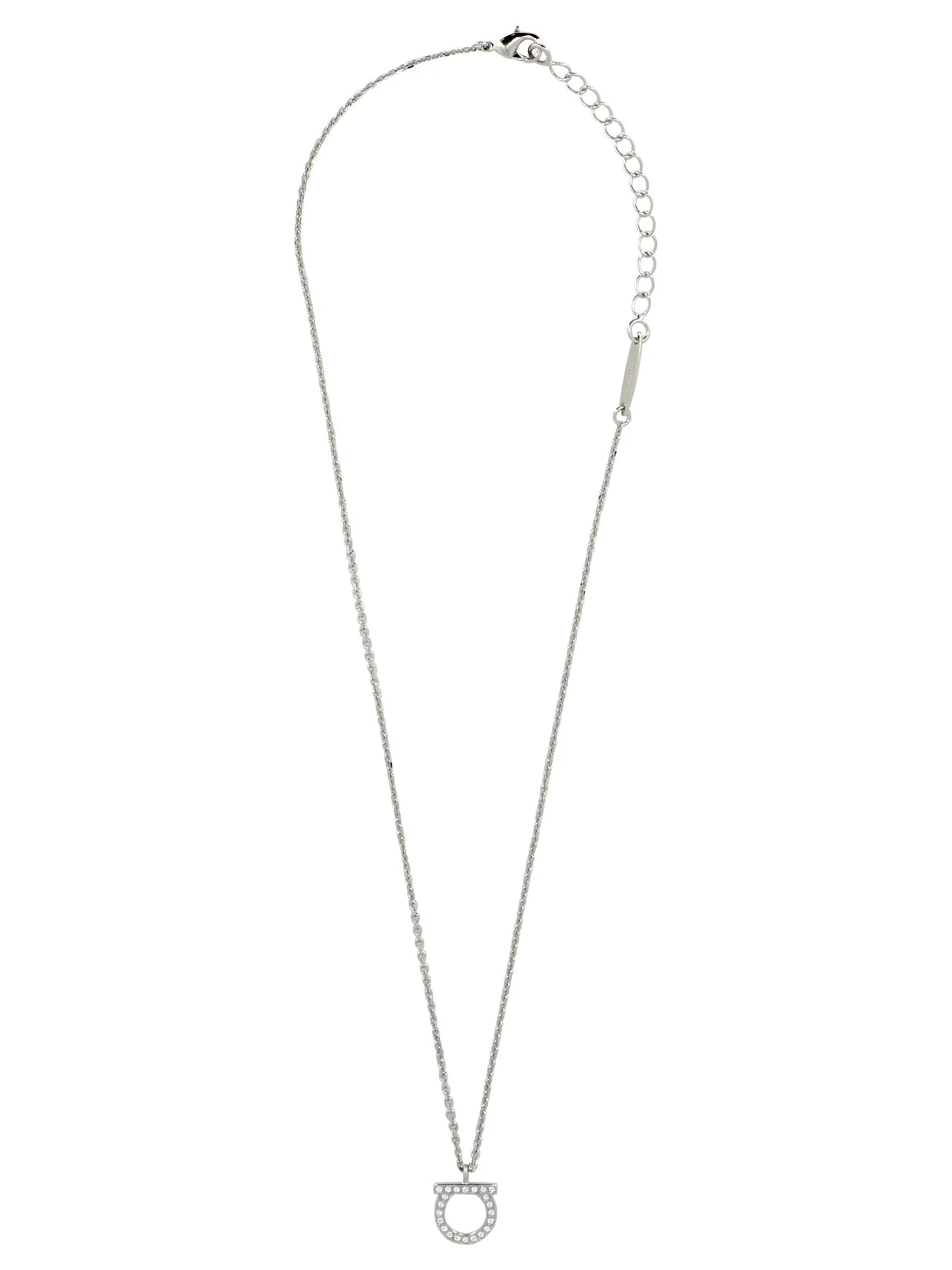 Ferragamo "Gancini" necklace, constructed with brass chain and adjustable clasp. The central pendant, made according to the typical Gancini silhouette, is decorated with crystal applications. The necklace structure is composed of fine links and a linear frame that supports the pendant while maintaining a clean profile and adjustable fit at the neck. Polished finish details complement the metal surface. || - Gancini pendant decorated with crystals - Adjustable closure 99% brass 1% glass SKU: 0696657 Our Products Are 100% Genuine. In All Cases We Stand By The Authenticity Of Every Product Sold On Our Site. All sales are final and we only accept returns for quality issue. Buyer is responsible for any import tax/duty if applicable.