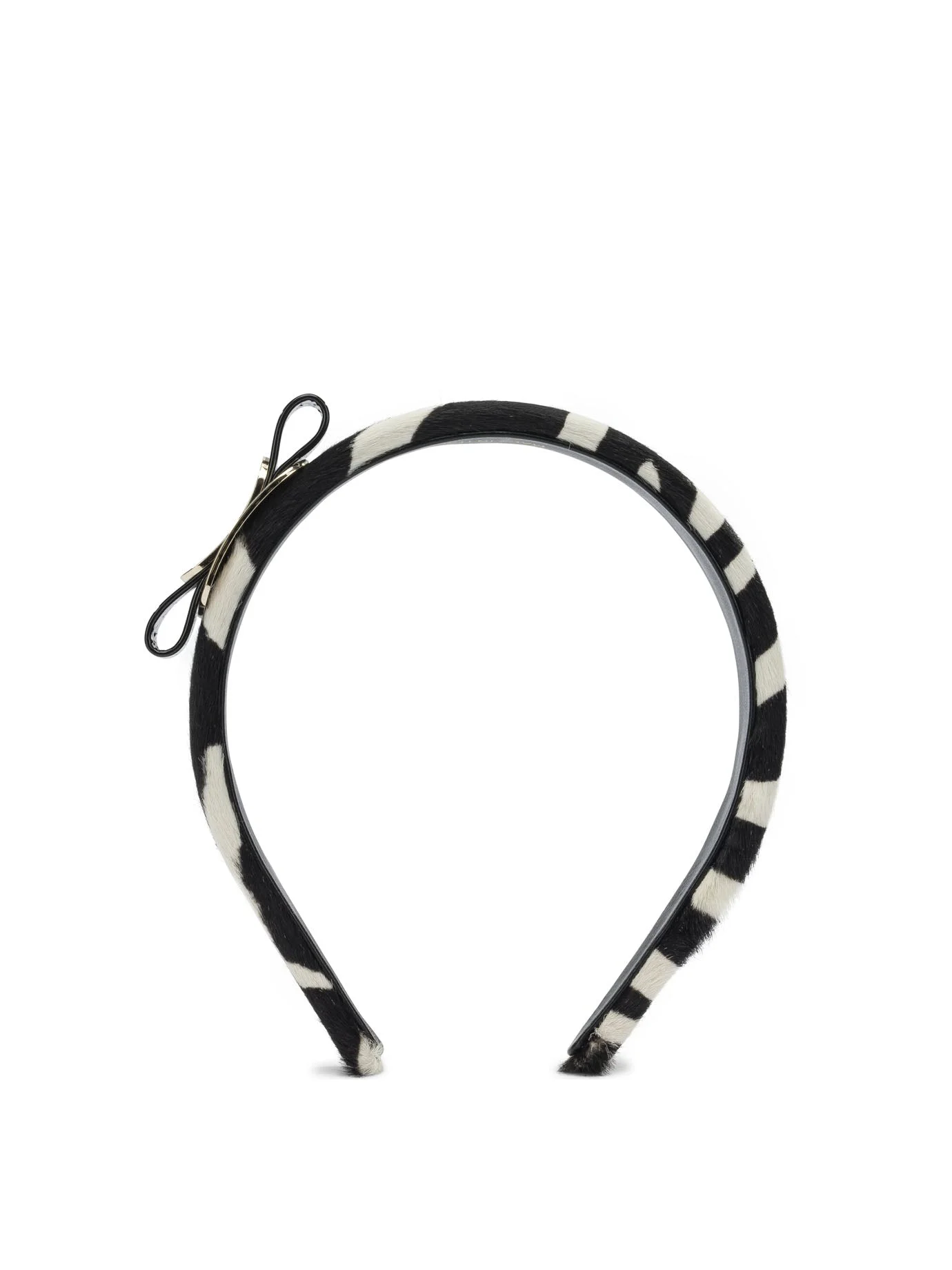 Ferragamo ponyhair "Vara" headband made with textured base and evenly textured ponyhair covered surface. Slim profile rounded silhouette and iconic Vara bow applied centrally. The workmanship includes a gold-tone metal plaque and patent leather detail on the bow. Rigid construction designed to fit the line of the garment while maintaining a snug fit. || - Pony with two-tone zebra pattern - Vara fabric bow and patent leather detailing - Gold-finish metal plaque applied to the bow - Rigid structure for stability during use 100% calfskin - 100% bras SKU: 0791472 Our Products Are 100% Genuine. In All Cases We Stand By The Authenticity Of Every Product Sold On Our Site. All sales are final and we only accept returns for quality issue. Buyer is responsible for any import tax/duty if applicable.
