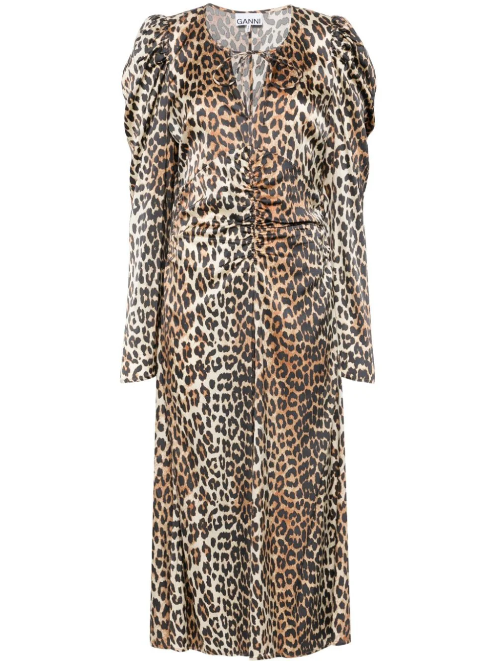LEOPARD PRINT SATIN RUCHED MIDI DRESS