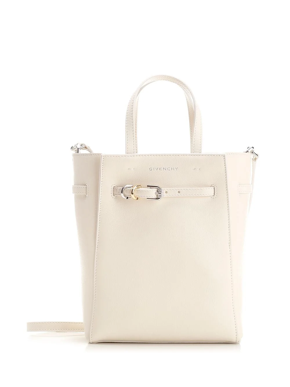 "Voyou" mini tote in black leather from Givenchy, with fixed handles, embossed Givenchy signature on the front, adjustable leather strap with shiny metal buckle and rings, adjustable shoulder strap with hooks, suede interior. 19x23,5x8 cm 100 % CALF LEATHER Made in: IT SKU: BB50ZTB231105 Our Products Are 100% Genuine. In All Cases We Stand By The Authenticity Of Every Product Sold On Our Site. All sales are final and we only accept returns for quality issue. Buyer is responsible for any import tax/duty if applicable.