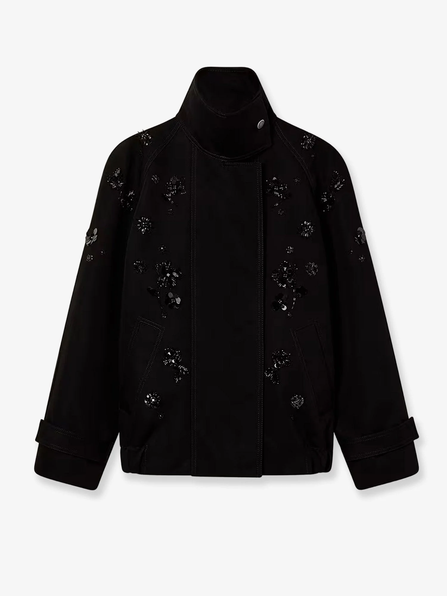 Women’s oversized jacket in black cotton twill with floral sequin embroidery
