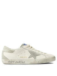 Golden Goose "Super-Star" sneakers with upper made of cowhide leather. The silhouette features a low-top construction, with a rear suede insert applied to the heel. The inner lining is made of mixed material, while the fit is shaped by a rubber sole. The upper includes a side-applied star and metal lettering details. The entire construction receives a vintage treatment that gives a lived-in texture. || - Cowhide leather upper - Suede heel and side star - Metal stud lettering applied to the upper - Rubber outsole - Mixed material lining - Vintage treatment 69% ovine leather 31% cow leather - 100% rubber SKU: GMF00102F00535911166 Our Products Are 100% Genuine. In All Cases We Stand By The Authenticity Of Every Product Sold On Our Site. All sales are final and we only accept returns for quality issue. Buyer is responsible for any import tax/duty if applicable.